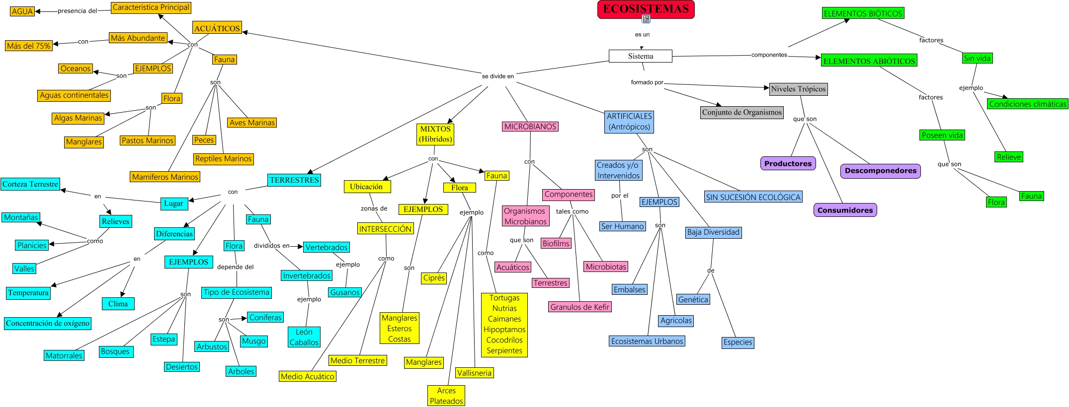 Este Cmap, tiene información relacionada con: ECOSISTEMAS, Sistema se divide en ACUÁTICOS, ARTIFICIALES (Antrópicos) son SIN SUCESIÓN ECOLÓGICA, Flora ejemplo Arces Plateados, Más Abundante con Más del 75%, Componentes tales como Microbiotas, MICROBIANOS con Organismos Microbianos, ACUÁTICOS con Flora, EJEMPLOS son Estepa, ARTIFICIALES (Antrópicos) son Creados y/o Intervenidos, Sistema se divide en MIXTOS (Hibridos), Tipo de Ecosistema son Arbustos, Sin vida ejemplo Condiciones climáticas, Ubicación zonas de INTERSECCIÓN, MICROBIANOS con Componentes, Baja Diversidad de Genética, Fauna divididos en Vertebrados, Fauna son Peces, Flora son Manglares, Relieves como Valles, Fauna son Aves Marinas