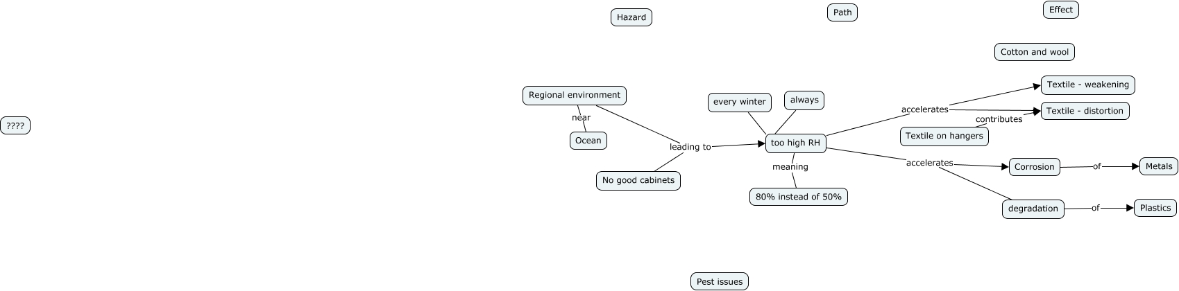 This Concept Map, created with IHMC CmapTools, has information related to: High RH in Lisbon textile collection, Textile on hangers contributes Textile - distortion, too high RH meaning 80% instead of 50%, Regional environment near Ocean, too high RH accelerates Textile - weakening, No good cabinets leading to too high RH, too high RH accelerates Corrosion, every winter too high RH, degradation of Plastics, too high RH accelerates degradation, Corrosion of Metals, always too high RH, Regional environment leading to too high RH, too high RH accelerates Textile - distortion