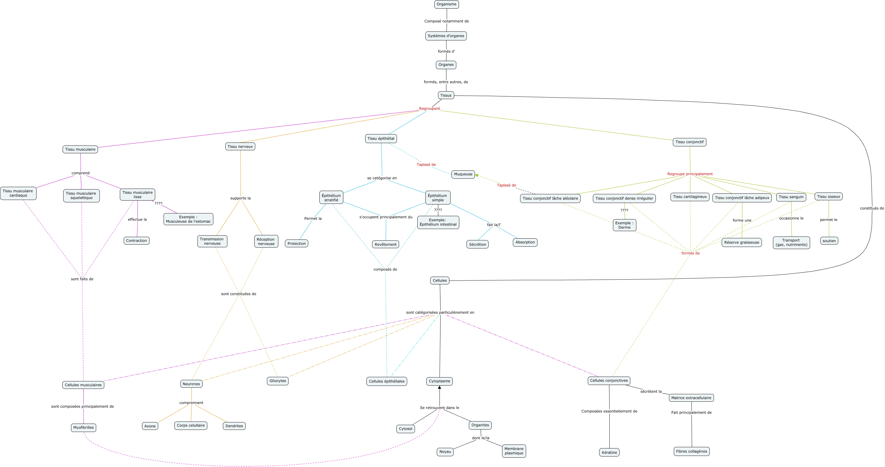 Cette carte de concepts créée avec IHMC CmapTools traite de: Sans titre, Tissu musculaire squelettique sont faits de Tissu musculaire cardiaque, Matrice extracellulaire sécrètent la Cellules conjonctives, Tissu musculaire squelettique sont faits de Tissu musculaire lisse, Tissu conjonctif lâche adipeux forme une Réserve graisseuse, Tissu cartilagineux formés de Tissu sanguin, Tissu osseux permet le soutien, Organites dont le/la Membrane plasmique, Tissu musculaire comprend Tissu musculaire lisse, Tissu épithélial Regroupent Tissu nerveux, Épithélium stratifié s'occupent principalement du Épithélium simple, Tissu musculaire squelettique sont faits de Cellules musculaires, Cellules sont catégorisées particulièrement en Gliocytes, Absorption fait la/l' Épithélium simple, Cellules sont catégorisées particulièrement en Cellules conjonctives, Systèmes d'organes formés d' Organes, Transmission nerveuse sont constituées de Réception nerveuse, Tissu conjonctif Regroupe principalement Tissu osseux, Tissu cartilagineux formés de Tissu osseux, Tissus constitués de Cellules, Tissu musculaire lisse effectue la Contraction