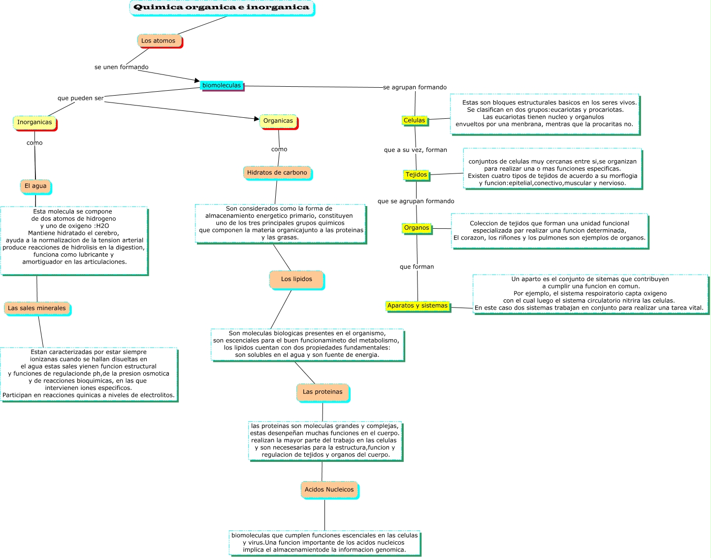 Este Cmap, tiene información relacionada con: organigrama de la quimica organica e inorganica, Los atomos se unen formando biomoleculas, biomoleculas se agrupan formando Celulas, Tejidos que se agrupan formando Organos, Hidratos de carbono ???? Los lipidos, Las proteinas ???? Acidos Nucleicos, Organos ???? Coleccion de tejidos que forman una unidad funcional especializada par realizar una funcion determinada, El corazon, los riñones y los pulmones son ejemplos de organos., Celulas que a su vez, forman Tejidos, Inorganicas como Las sales minerales, El agua como Las sales minerales, Aparatos y sistemas ???? Un aparto es el conjunto de sitemas que contribuyen a cumplir una funcion en comun. Por ejemplo, el sistema respoiratorio capta oxigeno con el cual luego el sistema circulatorio nitrira las celulas. En este caso dos sistemas trabajan en conjunto para realizar una tarea vital., Quimica organica e inorganica ???? Los atomos, El agua ???? Esta molecula se compone de dos atomos de hidrogeno y uno de oxigeno :H2O Mantiene hidratado el cerebro, ayuda a la normalizacion de la tension arterial produce reacciones de hidrolisis en la digestion, funciona como lubricante y amortiguador en las articulaciones., Los lipidos ???? Las proteinas, biomoleculas que pueden ser Organicas, Organos que forman Aparatos y sistemas, Tejidos ???? conjuntos de celulas muy cercanas entre si,se organizan para realizar una o mas funciones especificas. Existen cuatro tipos de tejidos de acuerdo a su morflogia y funcion:epitelial,conectivo,muscular y nervioso., biomoleculas que pueden ser Inorganicas, Acidos Nucleicos ???? biomoleculas que cumplen funciones escenciales en las celulas y virus.Una funcion importante de los acidos nucleicos implica el almacenamientode la informacion genomica., Organicas como Hidratos de carbono, Las sales minerales ???? Estan caracterizadas por estar siempre ionizanas cuando se hallan disueltas en el agua estas sales yienen funcion estructural y funciones de regulacionde ph,de la presion osmotica y de reacciones bioquimicas, en las que intervienen iones especificos. Participan en reacciones quinicas a niveles de electrolitos.