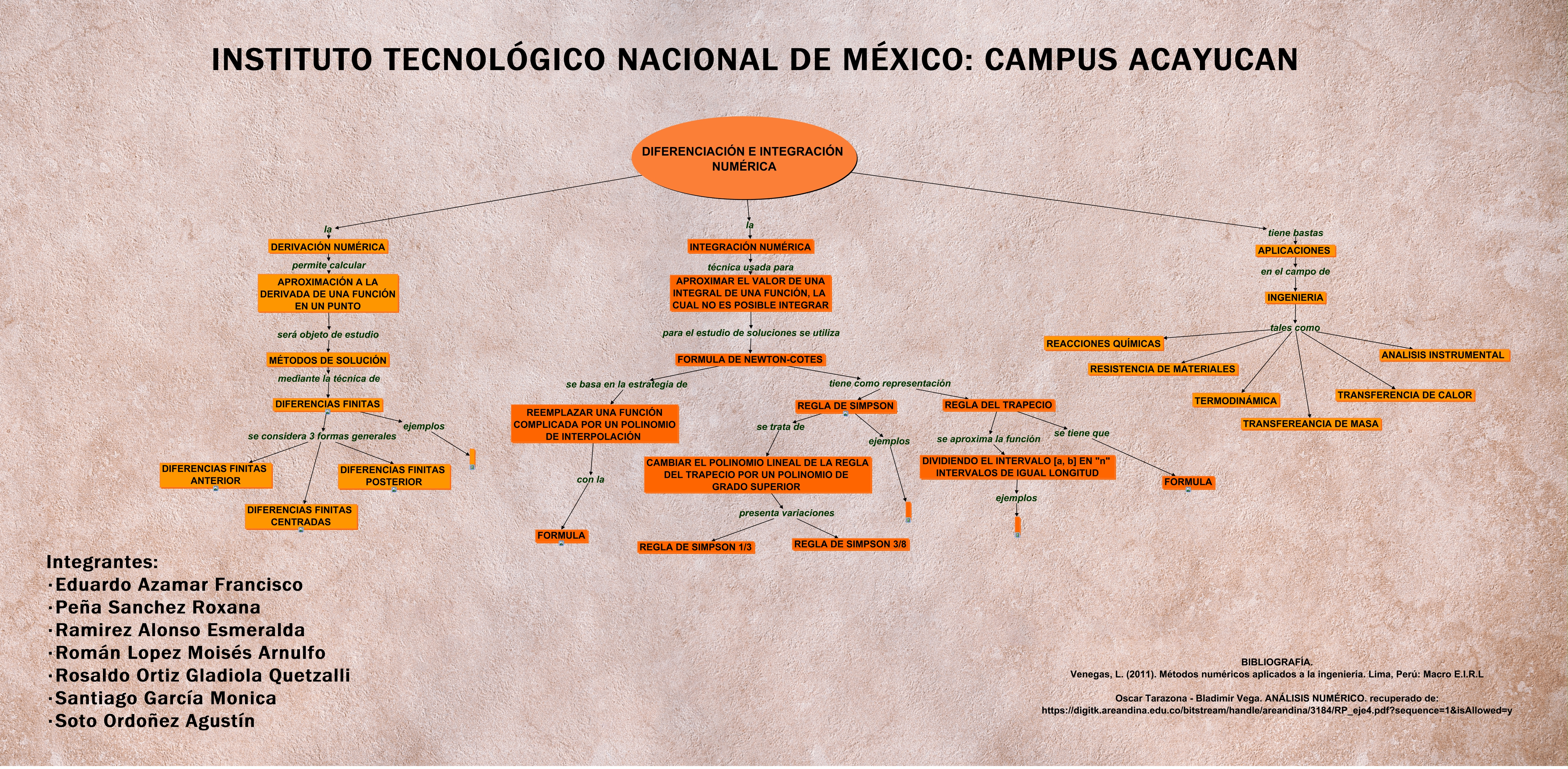 Este Cmap, tiene información relacionada con: DIFERENCIACIÓN E INTEGRACIÓN NUMERICA, FORMULA DE NEWTON-COTES se basa en la estrategia de REEMPLAZAR UNA FUNCIÓN COMPLICADA POR UN POLINOMIO DE INTERPOLACIÓN, REGLA DE SIMPSON se trata de CAMBIAR EL POLINOMIO LINEAL DE LA REGLA DEL TRAPECIO POR UN POLINOMIO DE GRADO SUPERIOR, REGLA DEL TRAPECIO se tiene que FORMULA, DIFERENCIACIÓN E INTEGRACIÓN NUMÉRICA tiene bastas APLICACIONES, DERIVACIÓN NUMÉRICA permite calcular APROXIMACIÓN A LA DERIVADA DE UNA FUNCIÓN EN UN PUNTO, CAMBIAR EL POLINOMIO LINEAL DE LA REGLA DEL TRAPECIO POR UN POLINOMIO DE GRADO SUPERIOR presenta variaciones REGLA DE SIMPSON 1/3, DIFERENCIAS FINITAS se considera 3 formas generales DIFERENCIAS FINITAS POSTERIOR, REEMPLAZAR UNA FUNCIÓN COMPLICADA POR UN POLINOMIO DE INTERPOLACIÓN con la FORMULA, INGENIERIA tales como TRANSFEREANCIA DE MASA, FORMULA DE NEWTON-COTES tiene como representación REGLA DE SIMPSON, DIFERENCIACIÓN E INTEGRACIÓN NUMÉRICA la INTEGRACIÓN NUMÉRICA, INGENIERIA tales como REACCIONES QUÍMICAS, DIFERENCIACIÓN E INTEGRACIÓN NUMÉRICA la DERIVACIÓN NUMÉRICA, DIFERENCIAS FINITAS ejemplos, INGENIERIA tales como TERMODINÁMICA, INTEGRACIÓN NUMÉRICA técnica usada para APROXIMAR EL VALOR DE UNA INTEGRAL DE UNA FUNCIÓN, LA CUAL NO ES POSIBLE INTEGRAR, FORMULA DE NEWTON-COTES tiene como representación REGLA DEL TRAPECIO, CAMBIAR EL POLINOMIO LINEAL DE LA REGLA DEL TRAPECIO POR UN POLINOMIO DE GRADO SUPERIOR presenta variaciones REGLA DE SIMPSON 3/8, DIFERENCIAS FINITAS se considera 3 formas generales DIFERENCIAS FINITAS CENTRADAS, INGENIERIA tales como TRANSFERENCIA DE CALOR