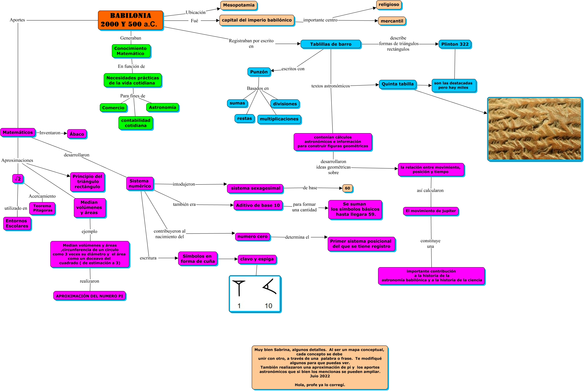 Este Cmap, tiene información relacionada con: 1.Babilonia. Castronuovo Sabrina, Quinta tabilla son las destacadas pero hay miles, Matemáticos desarrollaron Sistema numérico, Necesidades prácticas de la vida cotidiana Para fines de contabilidad cotidiana, Plinton 322 son las destacadas pero hay miles, Punzón Basados en multiplicaciones, Matemáticos Aproximaciones Principio del triángulo rectángulo, Sistema numérico también era Aditivo de base 10, clavo y espiga, El movimiento de jupiter constituye una importante contribución a la historia de la astronomía babilónica y a la historia de la ciencia, Sistema numérico contribuyeron al nacimiento del numero cero, Punzón Basados en sumas, capital del imperio babilónico importante centro religioso, Tablillas de barro escritos con Punzón, Tablillas de barro textos astronómicos Quinta tabilla, Babilonia 2000 Y 500 a.C. Fué capital del imperio babilónico, Necesidades prácticas de la vida cotidiana Para fines de Astronomía, Matemáticos Aproximaciones <math xmlns="http://www.w3.org/1998/Math/MathML"> <mrow> <msqrt> <mtext> 2 </mtext> </msqrt> </mrow> </math>, la relación entre movimiento, posición y tiempo así calcularon El movimiento de jupiter, contenían cálculos astronómicos e información para construir figuras geométricas desarrollaron ideas geométricas sobre la relación entre movimiento, posición y tiempo, Conocimiento Matemático En función de Necesidades prácticas de la vida cotidiana