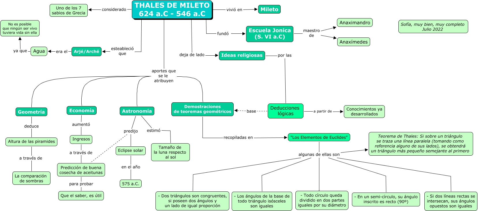 This Concept Map, created with IHMC CmapTools, has information related to: CUCCHIARELLI - THALES DE MILETO, "Los Elementos de Euclides" algunas de ellas son - En un semi-círculo, su ángulo inscrito es recto (90º), THALES DE MILETO 624 a.C - 546 a.C aportes que se le atribuyen Demostraciones de teoremas geométricos, Altura de las piramides a través de La comparación de sombras, Demostraciones de teoremas geométricos recopiladas en "Los Elementos de Euclides", Ingresos a través de Predicción de buena cosecha de aceitunas, THALES DE MILETO 624 a.C - 546 a.C aportes que se le atribuyen Economía, Economía aumentó Ingresos, "Los Elementos de Euclides" algunas de ellas son - Los ángulos de la base de todo triángulo isósceles son iguales, "Los Elementos de Euclides" algunas de ellas son - Dos triángulos son congruentes, si poseen dos ángulos y un lado de igual proporción, THALES DE MILETO 624 a.C - 546 a.C fundó Escuela Jonica (S. VI a.C), "Los Elementos de Euclides" algunas de ellas son - Todo círculo queda dividido en dos partes iguales por su diámetro, Predicción de buena cosecha de aceitunas para probar Que el saber, es útil, THALES DE MILETO 624 a.C - 546 a.C aportes que se le atribuyen Geometría, Arjé/Arché era el Agua, THALES DE MILETO 624 a.C - 546 a.C considerado Uno de los 7 sabios de Grecia, Astronomía predijo Eclipse solar, THALES DE MILETO 624 a.C - 546 a.C esteableció que Arjé/Arché, THALES DE MILETO 624 a.C - 546 a.C aportes que se le atribuyen Astronomía, Astronomía estimó Tamaño de la luna respecto al sol, THALES DE MILETO 624 a.C - 546 a.C vivió en Mileto