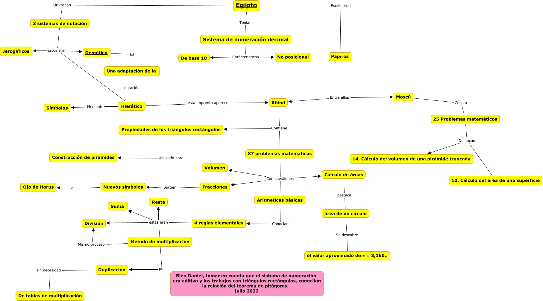 This Concept Map, created with IHMC CmapTools, has information related to: Mapa_Conceptual_Egipto, Egipto Escribieron Papiros, 25 Problemas matemáticos Destacan 14. Cálculo del volumen de una pirámide truncada, 4 reglas elementales estás eran Resta, Duplicación sin necesidad De tablas de multiplicación, Cálculo de áreas destaca área de un círculo, Metodo de multiplicación por Duplicación, Nuevos simbolos el Ojo de Horus, Aritmeticas básicas Conocian 4 reglas elementales, 4 reglas elementales estás eran División, Moscú Consta 25 Problemas matemáticos, 4 reglas elementales estás eran Suma, 87 problemas matematicos Con cuestiones Fracciones, 3 sistemas de notación Estos eran Demótico, Egipto Utilizaban 3 sistemas de notación, Sistema de numeración decimal Carácteristicas De base 10, 4 reglas elementales estás eran Metodo de multiplicación, Sistema de numeración decimal Carácteristicas No posicional, Papiros Entre ellos Moscú, Rhind Contiene 87 problemas matematicos, Egipto Tenian Sistema de numeración decimal