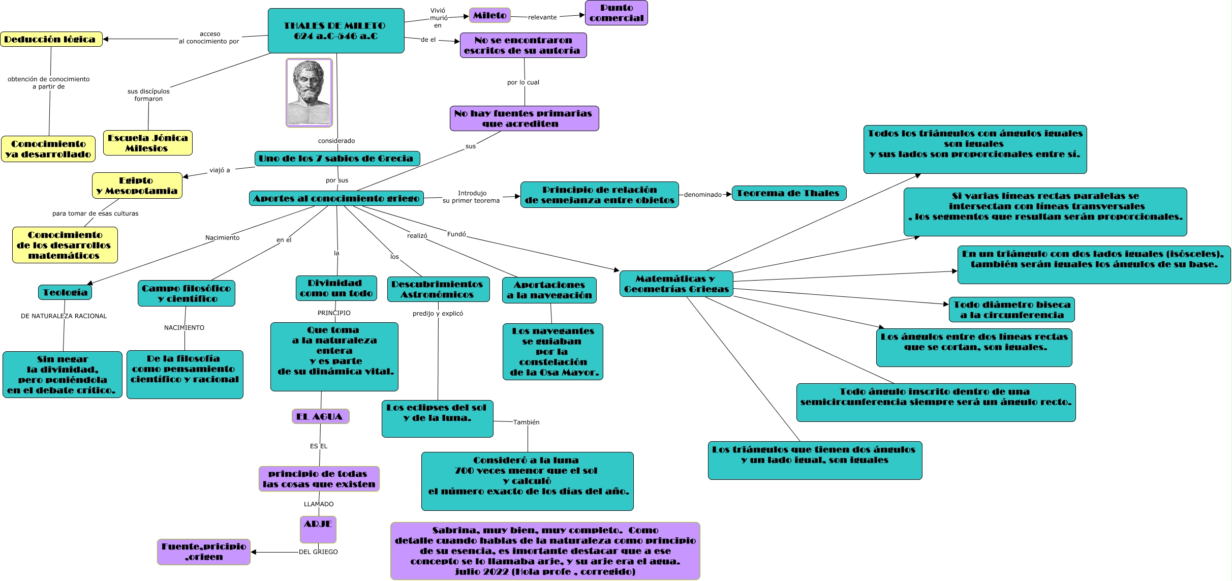 Este Cmap, tiene información relacionada con: 3.Thales de Mileto.Castronuovo Sabrina, Matemáticas y Geometrías Griegas Todo diámetro biseca a la circunferencia, THALES DE MILETO 624 a.C-546 a.C Vivió murió en Mileto, Aportes al conocimiento griego Nacimiento Teología, Aportes al conocimiento griego la Divinidad como un todo, Uno de los 7 sabios de Grecia viajó a Egipto y Mesopotamia, principio de todas las cosas que existen LLAMADO ARJE, EL AGUA ES EL principio de todas las cosas que existen, THALES DE MILETO 624 a.C-546 a.C sus discípulos formaron Escuela Jónica Milesios, Matemáticas y Geometrías Griegas Si varias líneas rectas paralelas se intersectan con líneas transversales , los segmentos que resultan serán proporcionales., Aportes al conocimiento griego los Descubrimientos Astronómicos, Divinidad como un todo PRINCIPIO Que toma a la naturaleza entera y es parte de su dinámica vital., Matemáticas y Geometrías Griegas Los ángulos entre dos líneas rectas que se cortan, son iguales., THALES DE MILETO 624 a.C-546 a.C considerado Uno de los 7 sabios de Grecia, Egipto y Mesopotamia para tomar de esas culturas Conocimiento de los desarrollos matemáticos, Aportaciones a la navegación Los navegantes se guiaban por la constelación de la Osa Mayor., Principio de relación de semejanza entre objetos denominado Teorema de Thales, THALES DE MILETO 624 a.C-546 a.C acceso al conocimiento por Deducción lógica, Aportes al conocimiento griego en el Campo filosófico y científico, Matemáticas y Geometrías Griegas Los triángulos que tienen dos ángulos y un lado igual, son iguales, No se encontraron escritos de su autoría por lo cual No hay fuentes primarias que acrediten