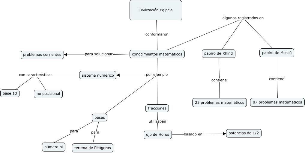 Este Cmap, tiene información relacionada con: Egipto, sistema numérico con características no posicional, Civilización Egipcia conformaron conocimientos matemáticos, conocimientos matemáticos por ejemplo sistema numérico, bases para terema de Pitágoras, papiro de Moscú contiene 87 problemas matemáticos, bases para número pi, fracciones utilizaban ojo de Horus, conocimientos matemáticos algunos registrados en papiro de Rhind, sistema numérico con características base 10, conocimientos matemáticos algunos registrados en papiro de Moscú, conocimientos matemáticos por ejemplo fracciones, conocimientos matemáticos para solucionar problemas corrientes, papiro de Rhind contiene 25 problemas matemáticos, ojo de Horus basado en potencias de 1/2, conocimientos matemáticos por ejemplo bases