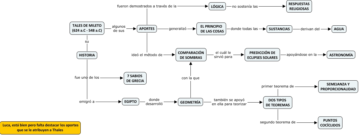 This Concept Map, created with IHMC CmapTools, has information related to: Thales, APORTES ideó el método de COMPARACIÓN DE SOMBRAS, APORTES fueron demostrados a través de la LÓGICA, EL PRINCIPIO DE LAS COSAS donde todas las SUSTANCIAS, TALES DE MILETO (624 a.C - 548 a.C) su HISTORIA, APORTES generalizó EL PRINCIPIO DE LAS COSAS, SUSTANCIAS derivan del AGUA, DOS TIPOS DE TEOREMAS primer teorema de SEMEJANZA Y PROPORCIONALIDAD, DOS TIPOS DE TEOREMAS segundo teorema de PUNTOS COCÍCLIDOS, LÓGICA no sostenía las RESPUESTAS RELIGIOSAS, TALES DE MILETO (624 a.C - 548 a.C) algunos de sus APORTES, PREDICCIÓN DE ECLIPSES SOLARES apoyándose en la ASTRONOMÍA, GEOMETRÍA con la que COMPARACIÓN DE SOMBRAS, GEOMETRÍA también se apoyó en ella para teorizar DOS TIPOS DE TEOREMAS, HISTORIA emigró a EGIPTO, HISTORIA fue uno de los 7 SABIOS DE GRECIA, EGIPTO donde desarrolló GEOMETRÍA, COMPARACIÓN DE SOMBRAS el cuál le sirvió para PREDICCIÓN DE ECLIPSES SOLARES