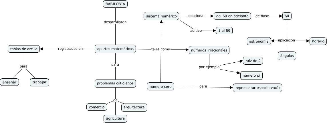 Este Cmap, tiene información relacionada con: Babilonia, aportes matemáticos registrados en tablas de arcilla, aportes matemáticos tales como números irracionales, BABILONIA desarrollaron aportes matemáticos, tablas de arcilla para enseñar, problemas cotidianos de agricultura, aportes matemáticos para problemas cotidianos, números irracionales por ejemplo raíz de 2, tablas de arcilla para trabajar, 60 aplicación ángulos, aportes matemáticos tales como sistema numérico, número cero para representar espacio vacío, problemas cotidianos de arquitectura, sistema numérico posicional del 60 en adelante, del 60 en adelante de base 60, problemas cotidianos de comercio, 60 aplicación astronomía, 60 aplicación horario, sistema numérico aditivo 1 al 59, números irracionales por ejemplo número pi, aportes matemáticos tales como número cero