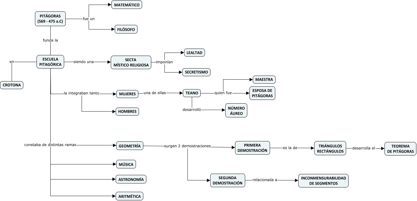 Este Cmap, tiene información relacionada con: Pitágoras, ESCUELA PITAGÓRICA constaba de distintas ramas ARITMÉTICA, PITÁGORAS (569 - 475 a.C) funda la ESCUELA PITAGÓRICA, TEANO quien fue MAESTRA, ESCUELA PITAGÓRICA en CROTONA, GEOMETRÍA surgen 2 demostraciones SEGUNDA DEMOSTRACIÓN, ESCUELA PITAGÓRICA constaba de distintas ramas ASTRONOMÍA, GEOMETRÍA surgen 2 demostraciones PRIMERA DEMOSTRACIÓN, ESCUELA PITAGÓRICA la integraban tanto MUJERES, ESCUELA PITAGÓRICA siendo una SECTA MÍSTICO RELIGIOSA, TEANO desarrolló NÚMERO ÁUREO, ESCUELA PITAGÓRICA constaba de distintas ramas MÚSICA, ESCUELA PITAGÓRICA la integraban tanto HOMBRES, SEGUNDA DEMOSTRACIÓN relacionada a INCONMENSURABILIDAD DE SEGMENTOS, PITÁGORAS (569 - 475 a.C) fue un MATEMÁTICO, SECTA MÍSTICO RELIGIOSA imponían LEALTAD, MUJERES una de ellas TEANO, PITÁGORAS (569 - 475 a.C) fue un FILÓSOFO, SECTA MÍSTICO RELIGIOSA imponían SECRETISMO, PRIMERA DEMOSTRACIÓN es la de TRIÁNGULOS RECTÁNGULOS, TRIÁNGULOS RECTÁNGULOS desarrolla el TEOREMA DE PITÁGORAS
