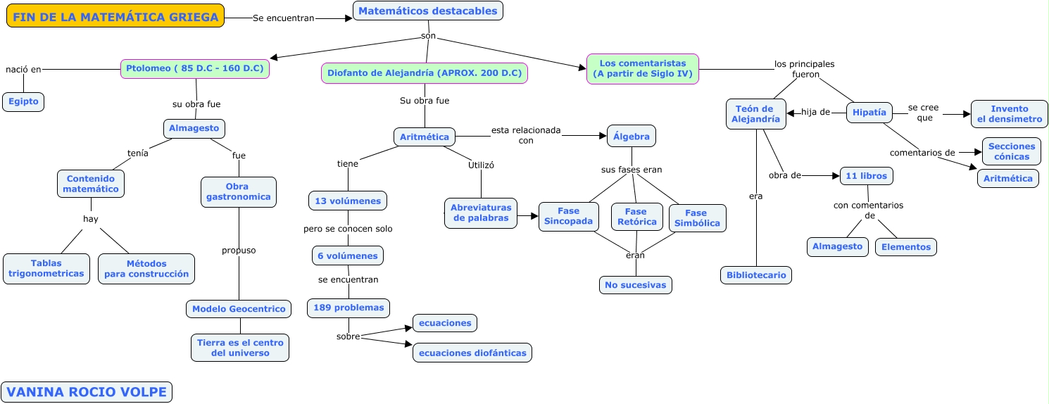 Este Cmap, tiene información relacionada con: 8-FIN DE LA MATEMATICA GRIEGA, Fase Retórica eran No sucesivas, Matemáticos destacables son Diofanto de Alejandría (APROX. 200 D.C), Aritmética tiene 13 volúmenes, Obra gastronomica propuso Modelo Geocentrico, Ptolomeo ( 85 D.C - 160 D.C) su obra fue Almagesto, Álgebra sus fases eran Fase Retórica, 6 volúmenes se encuentran 189 problemas, Almagesto tenía Contenido matemático, Hipatía se cree que Invento el densimetro, 11 libros con comentarios de Elementos, Fase Sincopada eran No sucesivas, 189 problemas sobre ecuaciones, Abreviaturas de palabras ???? Fase Sincopada, Fase Simbólica eran No sucesivas, Aritmética Utilizó Abreviaturas de palabras, Álgebra sus fases eran Fase Sincopada, Los comentaristas (A partir de Siglo IV) los principales fueron Hipatía, Contenido matemático hay Tablas trigonometricas, Contenido matemático hay Métodos para construcción, Modelo Geocentrico ???? Tierra es el centro del universo