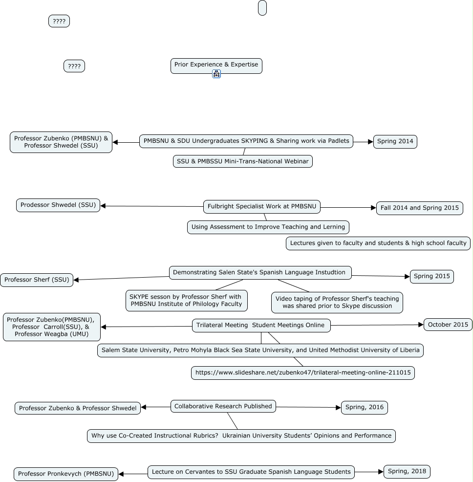 This Concept Map, created with IHMC CmapTools, has information related to: Prior Experience & Expertise, Fulbright Specialist Work at PMBSNU Fall 2014 and Spring 2015, Demonstrating Salen State's Spanish Language Instudtion Professor Sherf (SSU), Collaborative Research Published Professor Zubenko & Professor Shwedel, Fulbright Specialist Work at PMBSNU Using Assessment to Improve Teaching and Lerning, Lecture on Cervantes to SSU Graduate Spanish Language Students Professor Pronkevych (PMBSNU), Trilateral Meeting Student Meetings Online October 2015, Trilateral Meeting Student Meetings Online Salem State University, Petro Mohyla Black Sea State University, and United Methodist University of Liberia, Collaborative Research Published Why use Co-Created Instructional Rubrics? Ukrainian University Students’ Opinions and Performance, Demonstrating Salen State's Spanish Language Instudtion SKYPE sesson by Professor Sherf with PMBSNU Institute of Philology Faculty, Collaborative Research Published Spring, 2016, Trilateral Meeting Student Meetings Online Professor Zubenko(PMBSNU), Professor Carroll(SSU), & Professor Weagba (UMU), PMBSNU & SDU Undergraduates SKYPING & Sharing work via Padlets SSU & PMBSSU Mini-Trans-National Webinar, Fulbright Specialist Work at PMBSNU Prodessor Shwedel (SSU), Lecture on Cervantes to SSU Graduate Spanish Language Students ???? Spring, 2018, Demonstrating Salen State's Spanish Language Instudtion Video taping of Professor Sherf's teaching was shared prior to Skype discussion, PMBSNU & SDU Undergraduates SKYPING & Sharing work via Padlets Spring 2014, Trilateral Meeting Student Meetings Online https://www.slideshare.net/zubenko47/trilateral-meeting-online-211015, PMBSNU & SDU Undergraduates SKYPING & Sharing work via Padlets Professor Zubenko (PMBSNU) & Professor Shwedel (SSU), Demonstrating Salen State's Spanish Language Instudtion Spring 2015
