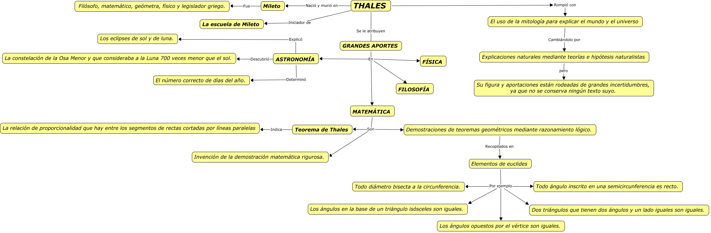 Este Cmap, tiene información relacionada con: 3. Thales, Demostraciones de teoremas geométricos mediante razonamiento lógico. Recopilados en Elementos de euclides, Elementos de euclides Por ejemplo Los ángulos en la base de un triángulo isósceles son iguales., Mileto Fue Filósofo, matemático, geómetra, físico y legislador griego., Elementos de euclides Por ejemplo Los ángulos opuestos por el vértice son iguales., GRANDES APORTES En FÍSICA, MATEMÁTICA Son Demostraciones de teoremas geométricos mediante razonamiento lógico., THALES Iniciador de La escuela de Mileto, Elementos de euclides Por ejemplo Dos triángulos que tienen dos ángulos y un lado iguales son iguales., THALES Rompió con El uso de la mitología para explicar el mundo y el universo, THALES Nació y murió en Mileto, El uso de la mitología para explicar el mundo y el universo Cambiándolo por Explicaciones naturales mediante teorías e hipótesis naturalistas, ASTRONOMÍA Determinó El número correcto de días del año., MATEMÁTICA Son Invención de la demostración matemática rigurosa., ASTRONOMÍA Explicó Los eclipses de sol y de luna., GRANDES APORTES En FILOSOFÍA, GRANDES APORTES En MATEMÁTICA, Teorema de Thales Indica La relación de proporcionalidad que hay entre los segmentos de rectas cortadas por líneas paralelas, GRANDES APORTES En ASTRONOMÍA, Elementos de euclides Por ejemplo Todo diámetro bisecta a la circunferencia., Explicaciones naturales mediante teorías e hipótesis naturalistas pero Su figura y aportaciones están rodeadas de grandes incertidumbres, ya que no se conserva ningún texto suyo.