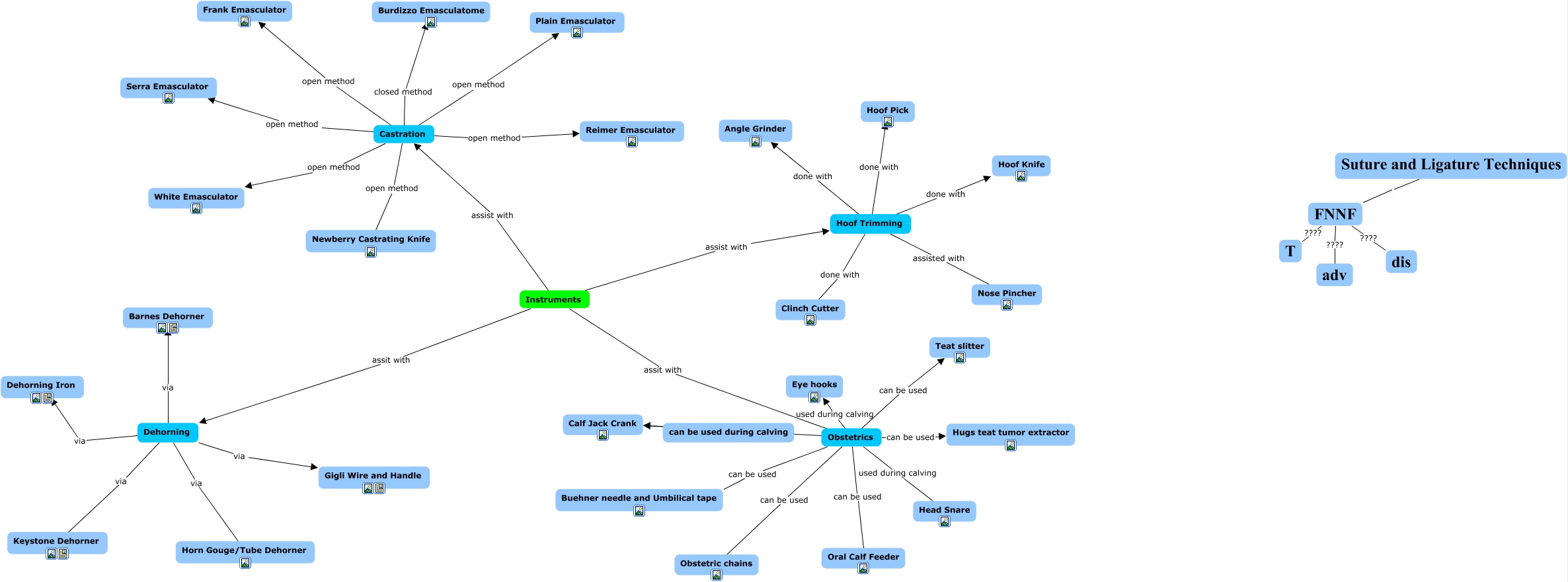 This Concept Map, created with IHMC CmapTools, has information related to: Equipment, Castration open method White Emasculator, Dehorning via Horn Gouge/Tube Dehorner, Obstetrics can be used Teat slitter, can be used during calving Calf Jack Crank, Castration closed method Burdizzo Emasculatome, Castration open method Reimer Emasculator, Hoof Trimming done with Angle Grinder, Obstetrics can be used Obstetric chains, Instruments assit with Obstetrics, Obstetrics ???? Calf Jack Crank, Hoof Trimming done with Hoof Knife, Hoof Trimming assisted with Nose Pincher, Dehorning via Gigli Wire and Handle, Obstetrics can be used Buehner needle and Umbilical tape, FNNF ???? T, Dehorning via Dehorning Iron, FNNF ???? dis, Obstetrics can be used Hugs teat tumor extractor, Instruments assist with Hoof Trimming, Dehorning via Keystone Dehorner