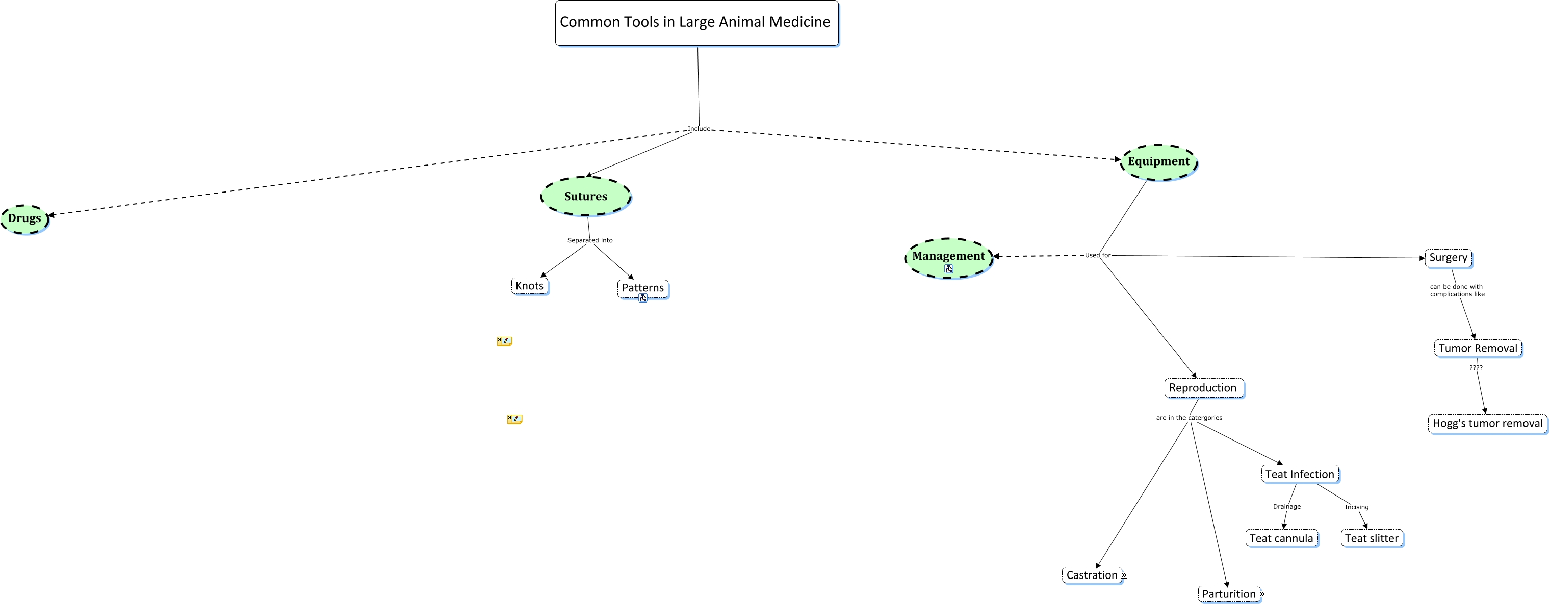 This Concept Map, created with IHMC CmapTools, has information related to: Copy of Group B Lab 1 Drugs, Equipment, Sutures, Reproduction are in the catergories Castration, Common Tools in Large Animal Medicine Include Drugs, Common Tools in Large Animal Medicine Include Sutures, Sutures Separated into Patterns, Teat Infection Incising Teat slitter, Sutures Separated into Knots, Equipment Used for Reproduction, Equipment Used for Surgery, Parturition Assist with the removal of calf Letter opener, Parturition Assist with the removal of calf Handles, Teat Infection Drainage Teat cannula, Common Tools in Large Animal Medicine Include Equipment, Reproduction are in the catergories Parturition, Parturition Assist with the removal of calf Head snare, Parturition Assist with the removal of calf Calf jack crank, Castration Cutting and crushing action Emasculator, Parturition Correction of vaginal prolapse Buhner needle, Emasculator with security ratchet Ratchet Emasculator, Parturition Assist with the removal of calf Calving chain, Parturition Assist with the removal of calf Calving rope