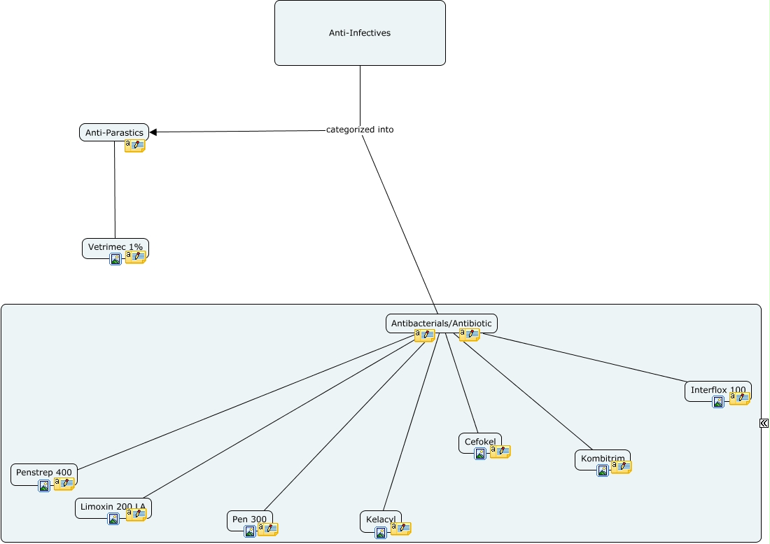 This Concept Map, created with IHMC CmapTools, has information related to: Anti Infectives Kelli and Orlando, Anti-Infectives categorized into Antibacterials/Antibiotic, Anti-Infectives categorized into Anti-Parastics, Anti-Parastics ???? Vetrimec 1%, Antibacterials/Antibiotic Kelacyl, Antibacterials/Antibiotic Limoxin 200 LA, Antibacterials/Antibiotic Kombitrim, Antibacterials/Antibiotic Penstrep 400, Antibacterials/Antibiotic Pen 300, Antibacterials/Antibiotic Interflox 100, Antibacterials/Antibiotic Cefokel