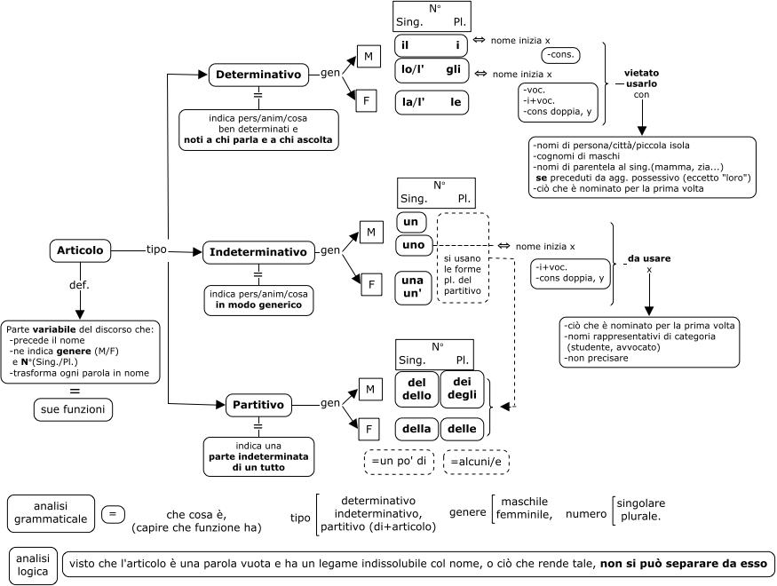 </mtext> </mfenced> </mrow> </math> vietato usarlo con -nomi di persona/città/piccola isola -cognomi di maschi -nomi di parentela al sing.(mamma, zia...) se preceduti da agg. possessivo (eccetto "loro") -ciò che è nominato per la prima volta, Articolo tipo Indeterminativo, Partitivo = indica una parte indeterminata di un tutto, uno ⇔ nome inizia x -i+voc. -cons doppia, y, Parte variabile del discorso che: -precede il nome -ne indica genere (M/F) e N°(Sing./Pl.) -trasforma ogni parola in nome = sue funzioni, Determinativo gen F, Partitivo gen F, uno ⇔ nome inizia x -i+voc. -cons doppia, y, Indeterminativo gen F, Articolo tipo Partitivo, Indeterminativo = indica pers/anim/cosa in modo generico, si usano le forme pl. del partitivo . <math xmlns="http://www.w3.org/1998/Math/MathML"> <mrow> <mfenced open="" close="}"> <mtext>