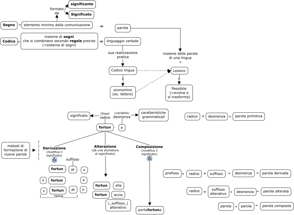 | </mtext> </math>, Codice lingua è economico (es. lettere), radice + desinenza, a (variabile) desinenza caratteristiche grammaticali, fortun - a, parola insieme delle parole di una lingua = Lessico, Codice = insieme di segni che si combinano secondo regole precise (=sistema di segni), suffisso alterativo + desinenza, elemento minimo della comunicazione ⇒ parola, linguaggio verbale sua realizzazione pratica Codice lingua, elemento minimo della comunicazione formato da significante, fortun (fissa) radice significato, radice + desinenza, radice + suffisso, fortun Composizione (modifica il significato), Lessico è flessibile (=evolve e si trasforma)