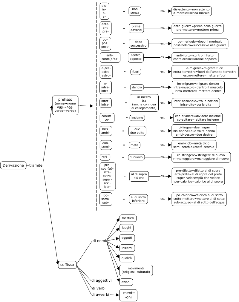 This Concept Map, created with IHMC CmapTools, has information related to: derivazione, suffisso di nomi oggetti, inter- infra- = in mezzo tra (anche con idea di collegamento), re/i- = di nuovo, Derivazione tramite suffisso, ipo- sotto- sub- = al di sotto inferiore, metà es. emi-ciclo=metà ciclo semi-cerchio=metà cerchio, anti- contr(o/a)- = contro opposto, fuori es. e-migrare=migrare fuori extra-terrestre=fuori dall'ambito terrestre estro-mettere=mettere fuori, suffisso di nomi luoghi, con/m- co- = insieme, suffisso di nomi movimenti (religiosi, culturali), suffisso di nomi azioni, bi/s- ambi- = due due volte, prima davanti es. ante-guerra=prima della guerra pre-mettere=mettere prima, in mezzo tra (anche con idea di collegamento) es. inter-nazionale=tra le nazioni infra-dito=tra le dita, Derivazione tramite prefisso (nome→nome agg.→agg. verbo→verbo), suffisso di nomi mestieri, suffisso di aggettivi ????, ante- anti pre- = prima davanti, in- intra- intro- = dentro