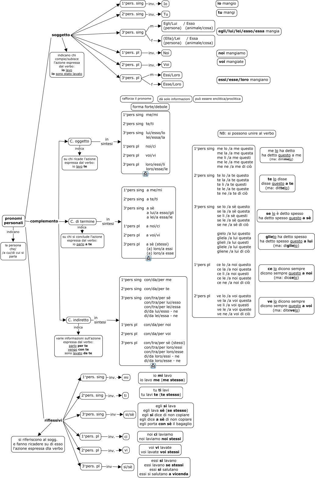 This Concept Map, created with IHMC CmapTools, has information related to: personale, 1°pers. sing inv. Io, pronomi personali riflessivi 1°pers. sing, C. oggetto in sintesi 1°pers sing me/mi 2°pers sing te/ti 3°pers sing lui/esso/lo lei/essa/la 1°pers pl noi/ci 2°pers pl voi/vi 3°pers pl loro/essi/li loro/esse/le, pronomi personali riflessivi 3°pers. sing, pronomi personali soggetto 3°pers. sing, pronomi personali riflessivi 1°pers. pl, 1°pers. pl inv. ci, 3°pers. sing inv si/sè, pronomi personali soggetto 3°pers. pl, 1°pers. pl inv. Noi, pronomi personali soggetto 2°pers. pl, pronomi personali indicano la persona che/ /a cui/di cui si parla, C. di termine in sintesi 1°pers sing a me/mi 2°pers sing a te/ti 3°pers sing a sè a lui/a esso/gli a lei/a essa/le 1°pers pl a noi/ci 2°pers pl a voi/vi 3°pers pl a sè (stessi) (a) loro/a essi (a) loro/a esse, pronomi personali soggetto 1°pers. pl, C. indiretto indica varie informazioni sull'azione espressa dal verbo: parlo per te vengo con te sono lavato da te, 2°pers. pl inv. vi, 3°pers. pl f Esse/Loro, pronomi personali riflessivi 2°pers. pl, 3°pers. sing f (Ella)/Lei / Essa (persona) (animale/cosa), pronomi personali riflessivi si riferiscono al sogg. e fanno ricadere su di esso l'azione espressa dla verbo
