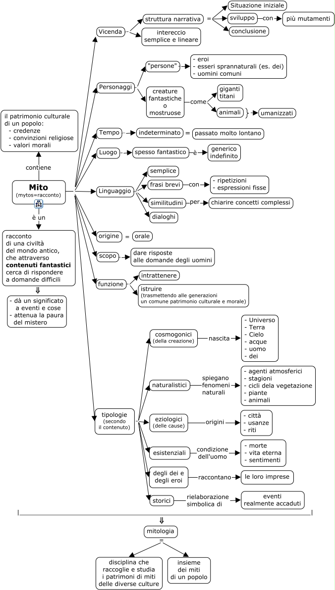 This Concept Map, created with IHMC CmapTools, has information related to: 05_il mito, similitudini per chiarire concetti complessi, Mito (mytos=racconto) è un racconto di una civiltà del mondo antico, che attraverso contenuti fantastici cerca di rispondere a domande difficili, tipologie (secondo il contenuto) . eziologici (delle cause), Mito (mytos=racconto) Linguaggio, esistenziali condizione dell'uomo - morte - vita eterna - sentimenti, |_____________________________________________________________________________| ⇓ mitologia, tipologie (secondo il contenuto) . degli dei e degli eroi, cosmogonici (della creazione) nascita - Universo - Terra - Cielo - acque - uomo - dei, Mito (mytos=racconto) Vicenda, struttura narrativa = sviluppo, Mito (mytos=racconto) origine, creature fantastiche o mostruose come giganti titani, Mito (mytos=racconto) scopo, struttura narrativa = Situazione iniziale, tipologie (secondo il contenuto) . naturalistici, tipologie (secondo il contenuto) . cosmogonici (della creazione), funzione . intrattenere, degli dei e degli eroi raccontano le loro imprese, storici rielaborazione simbolica di eventi realmente accaduti, Linguaggio . dialoghi