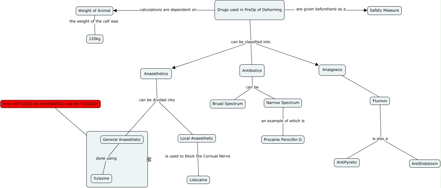 This Concept Map, created with IHMC CmapTools, has information related to: PREOP Drugs, Drugs used in PreOp of Dehorning calculations are dependent on Weight of Animal, Weight of Animal the weight of the calf was 120kg, Antibiotics can be Broad Spectrum, Flunixin is also a AntiEndotoxin, WAS NOT USED IN DEHORNING LAB ON TUESDAY ???? ????, Drugs used in PreOp of Dehorning can be classified into Antibiotics, Anaesthetics can be divided into General Anaesthetic, Anaesthetics can be divided into Local Anaesthetic, General Anaesthetic done using Xylazine, Narrow Spectrum an example of which is Procaine Penicillin G, Antibiotics can be Narrow Spectrum, Drugs used in PreOp of Dehorning can be classified into Analgesics, Local Anaesthetic is used to block the Cornual Nerve Lidocaine, Drugs used in PreOp of Dehorning can be classified into Anaesthetics, Drugs used in PreOp of Dehorning are given beforehand as a Safety Measure, Flunixin is also a AntiPyretic, Analgesics ???? Flunixin