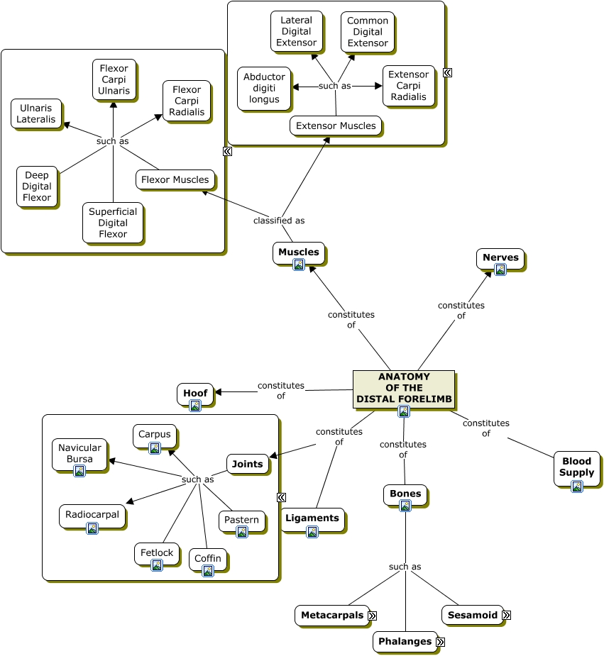 This Concept Map, created with IHMC CmapTools, has information related to: Anatomy Cmap, Flexor Muscles such as Flexor Carpi Radialis, Metacarpals including Fourth Metacarpal, ANATOMY OF THE DISTAL FORELIMB constitutes of Ligaments, Extensor Muscles such as Abductor digiti longus, Muscles classified as Flexor Muscles, Joints such as Fetlock, ANATOMY OF THE DISTAL FORELIMB constitutes of Hoof, ANATOMY OF THE DISTAL FORELIMB constitutes of Joints, Flexor Muscles such as Flexor Carpi Ulnaris, Sesamoid including Distal Sesamoid Bone, Joints such as Carpus, ANATOMY OF THE DISTAL FORELIMB constitutes of Muscles, Extensor Muscles such as Extensor Carpi Radialis, Phalanges including First Phalanx, Sesamoid including Proximal Sesamoid Bones, Metacarpals including Third Metacarpal, Joints such as Navicular Bursa, Extensor Muscles such as Lateral Digital Extensor, Phalanges including Second Phalanx, Muscles classified as Extensor Muscles