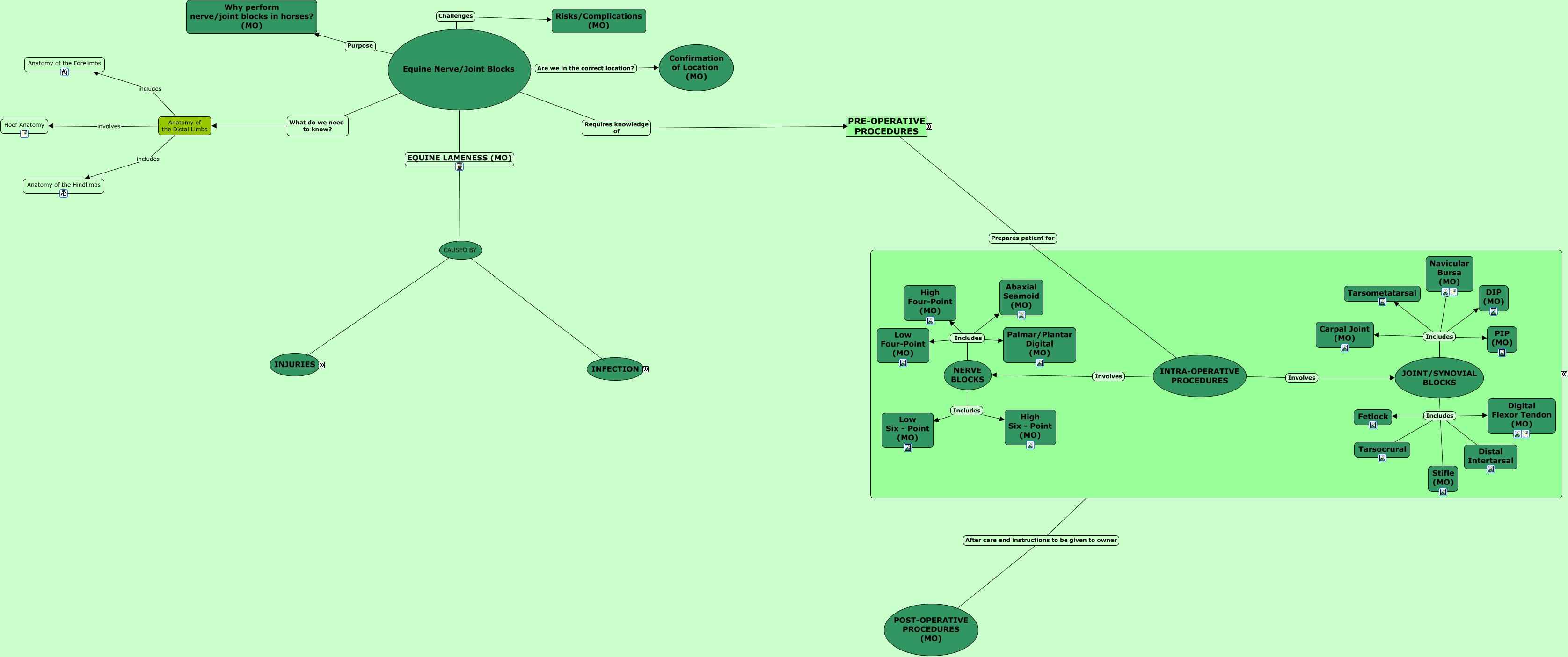 This Concept Map, created with IHMC CmapTools, has information related to: Equine Nerve Blocks, which includes OTHER INFECTIONS (MO), JOINT/SYNOVIAL BLOCKS Includes Distal Intertarsal, INTRA-OPERATIVE PROCEDURES Involves NERVE BLOCKS, Equine Nerve/Joint Blocks Purpose Why perform nerve/joint blocks in horses? (MO), JOINT/SYNOVIAL BLOCKS Includes Tarsometatarsal, JOINT/SYNOVIAL BLOCKS Includes DIP (MO), NERVE BLOCKS Includes High Four-Point (MO), CAUSED BY INFECTION which includes, CAUSED BY INJURIES which includes, NERVE BLOCKS Includes Low Four-Point (MO), JOINT/SYNOVIAL BLOCKS Includes Navicular Bursa (MO), which includes KERATOMA, PRE-OPERATIVE PROCEDURES Knowledge of Nerve Block (MO), PRE-OPERATIVE PROCEDURES Prepares patient for INTRA-OPERATIVE PROCEDURES, PRE-OPERATIVE PROCEDURES Informative Client Communicaton, JOINT/SYNOVIAL BLOCKS Includes PIP (MO), which includes SUBSOLAR ABSCESS (MO), PRE-OPERATIVE PROCEDURES Knowledge of Signalment and History (MO), Anatomy of the Distal Limbs involves Hoof Anatomy, PRE-OPERATIVE PROCEDURES Assessment Distance examination & GAIT assessment (MO)