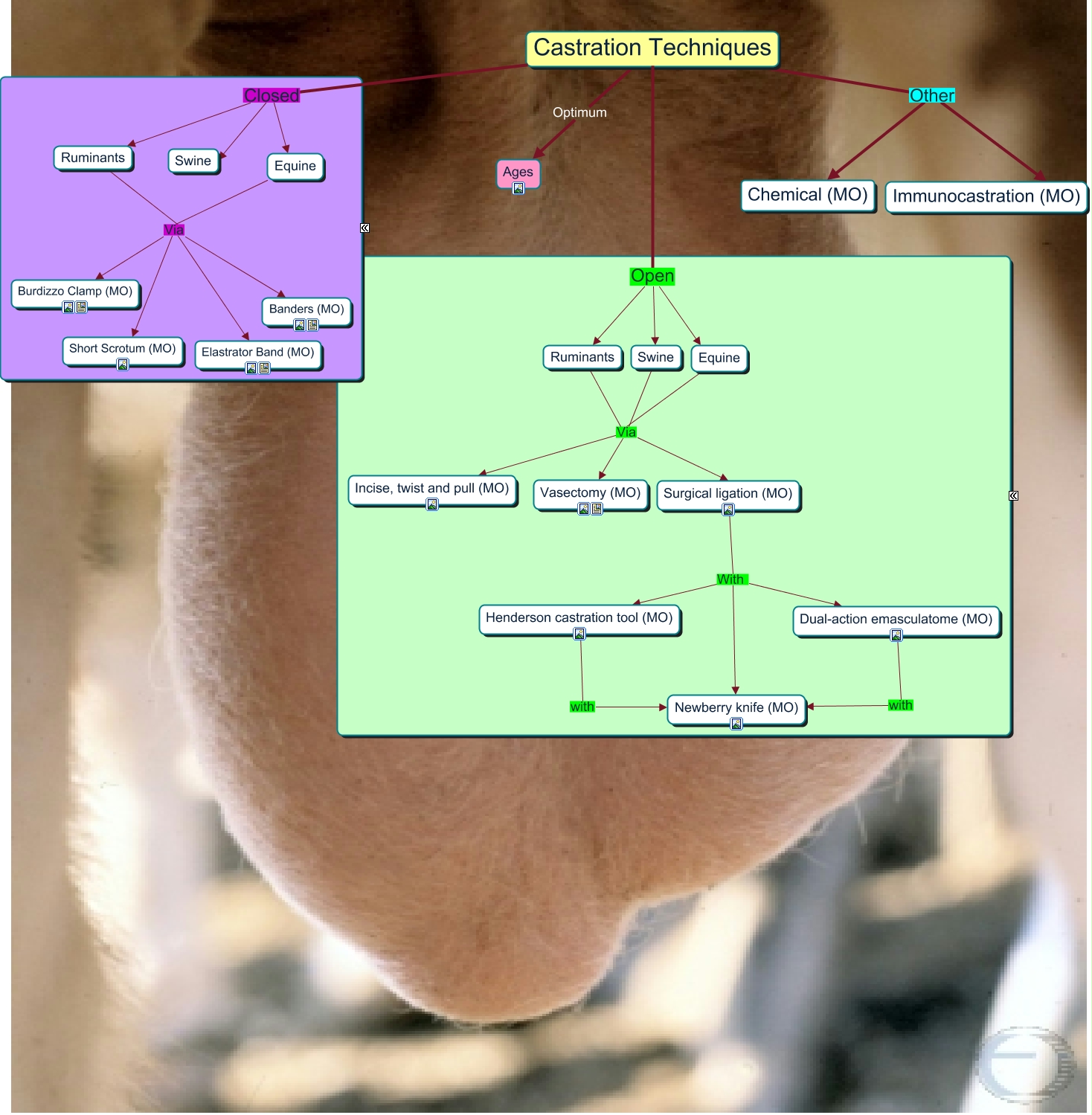 This Concept Map, created with IHMC CmapTools, has information related to: Intra-Operative Procedures, Dual-action emasculatome (MO) with Newberry knife (MO), Castration Techniques Open Ruminants, Ruminants Via Short Scrotum (MO), Castration Techniques Open Swine, Ruminants Via Incise, twist and pull (MO), Castration Techniques Open Equine, Equine Via Banders (MO), Castration Techniques Closed Swine, Ruminants Via Banders (MO), Ruminants Via Vasectomy (MO), Castration Techniques Other Chemical (MO), Surgical ligation (MO) With Henderson castration tool (MO), Equine Via Surgical ligation (MO), Henderson castration tool (MO) with Newberry knife (MO), Castration Techniques Closed Ruminants, Castration Techniques Optimum Ages, Ruminants Via Elastrator Band (MO), Swine Via Surgical ligation (MO), Surgical ligation (MO) With Dual-action emasculatome (MO), Swine Via Vasectomy (MO)