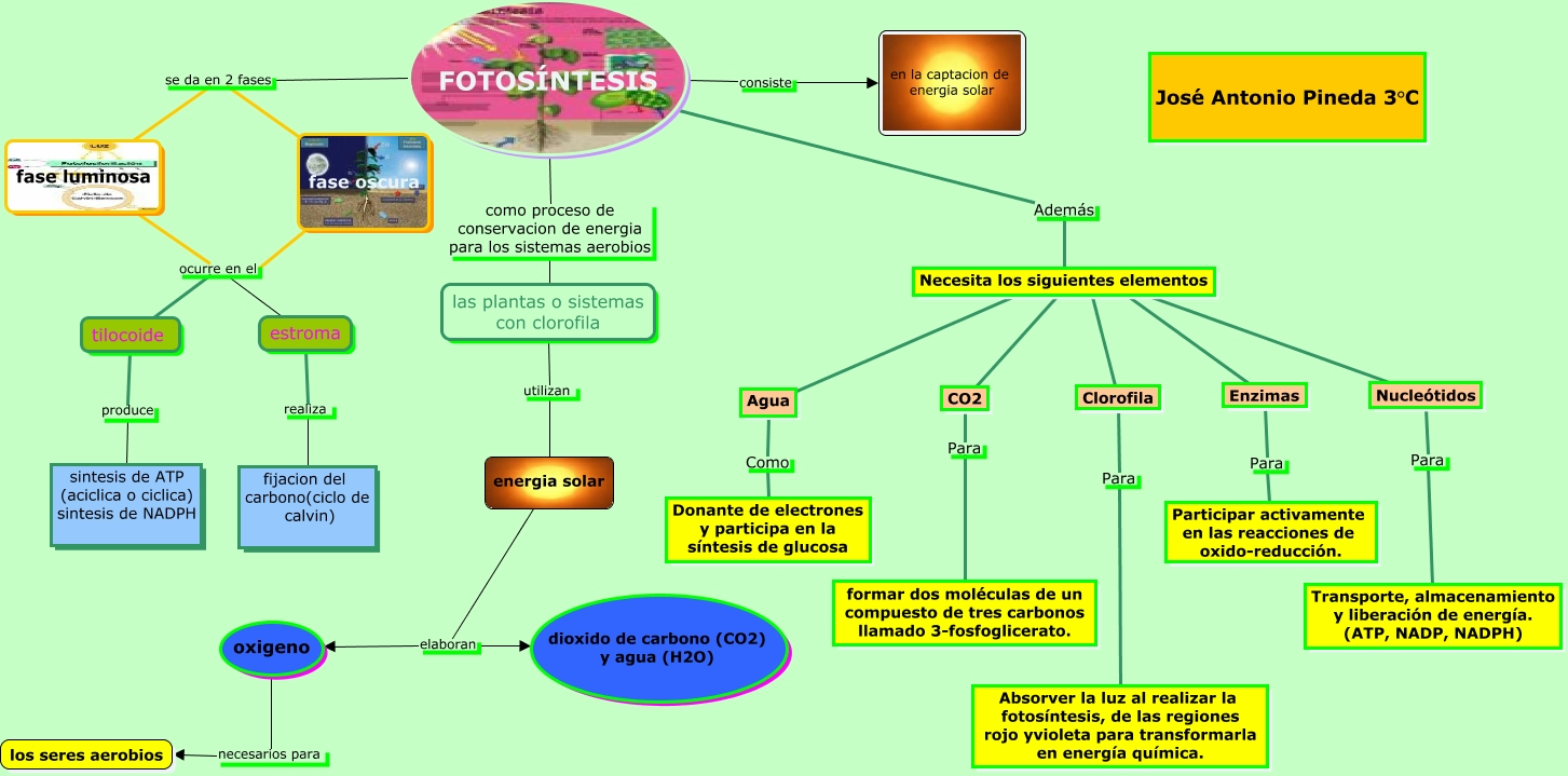 Este Cmap, tiene información relacionada con: Fotosintesis_mapa conceptual_José Antonio Pineda Moreno_3°C_Salud nutricional, Necesita los siguientes elementos ???? CO2, estroma realiza fijacion del carbono(ciclo de calvin), FOTOSÍNTESIS se da en 2 fases fase oscura, Necesita los siguientes elementos ???? Nucleótidos, FOTOSÍNTESIS se da en 2 fases fase luminosa, Enzimas Para Participar activamente en las reacciones de oxido-reducción., Agua Como Donante de electrones y participa en la síntesis de glucosa, Necesita los siguientes elementos ???? Agua, Clorofila Para Absorver la luz al realizar la fotosíntesis, de las regiones rojo yvioleta para transformarla en energía química., FOTOSÍNTESIS Además Necesita los siguientes elementos, CO2 Para formar dos moléculas de un compuesto de tres carbonos llamado 3-fosfoglicerato., energia solar elaboran dioxido de carbono (CO2) y agua (H2O), tilocoide produce sintesis de ATP (aciclica o ciclica) sintesis de NADPH, fase oscura ocurre en el tilocoide, Nucleótidos Para Transporte, almacenamiento y liberación de energía. (ATP, NADP, NADPH), oxigeno necesarios para los seres aerobios, FOTOSÍNTESIS consiste en la captacion de energia solar, energia solar elaboran oxigeno, fase luminosa ocurre en el tilocoide, Necesita los siguientes elementos ???? Clorofila