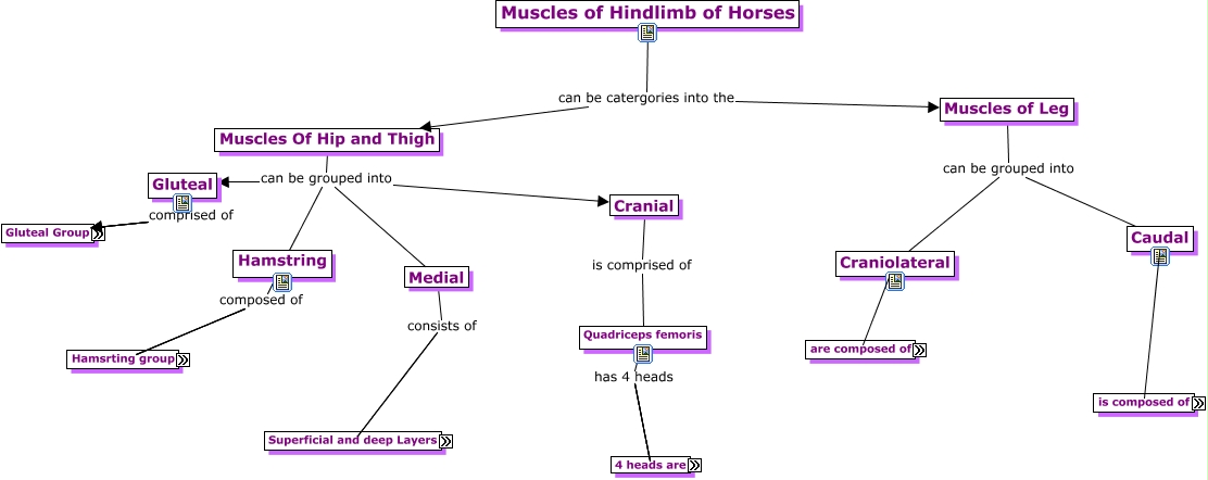 This Concept Map, created with IHMC CmapTools, has information related to: Muscles of Hindlimb of horse, Caudal composed of the Popliteus (MO), Middle has Pectineus (MO), Middle has Adductor (MO), Craniolateral composed of Tibialis Cranialis (MO), Gluteal comprised of Gluteus Superficialis (MO), Superficial has Gracilis (MO), Hamstring composed of Semitendinosus (MO), Muscles Of Hip and Thigh can be grouped into Cranial, Quadriceps femoris has 4 heads Rectus femoris (MO), Muscles of Leg can be grouped into Caudal, Gluteal comprised of Gluteus Profundus (MO), Hamstring composed of Biceps Femoris (MO), Muscles of Hindlimb of Horses can be catergories into the Muscles of Leg, Caudal composed of the Superficial deep flexor (MO), Medial consists of Middle, Muscles of Leg can be grouped into Craniolateral, Quadriceps femoris has 4 heads Vastus Intermedius (MO), Medial consists of Superficial, Caudal composed of the Gastrocnemius (MO), Gluteal comprised of Gluteus Medius (MO)