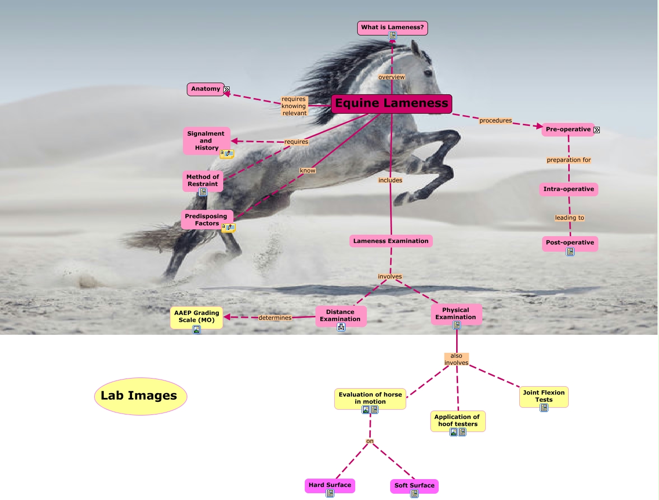 This Concept Map, created with IHMC CmapTools, has information related to: Equine Lameness Lab 4, Equine Lameness procedures Pre-operative, Physical Examination also involves Joint Flexion Tests, Equine Lameness includes Lameness Examination, Evaluation of horse in motion on Hard Surface, Anatomy must know Parts of the Hoof, Pre-operative preparation for Intra-operative, Equine Lameness overview What is Lameness?, Distance Examination determines AAEP Grading Scale (MO), Evaluation of horse in motion on Soft Surface, Drugs requires Pre-operative, Lameness Examination involves Distance Examination, Physical Examination also involves Application of hoof testers, Equine Lameness requires Method of Restraint, Anatomy must know Bone of lower limbs, Anatomy must know Muscles, Equine Lameness requires Signalment and History, Physical Examination also involves Evaluation of horse in motion, Equine Lameness know Predisposing Factors, Intra-operative leading to Post-operative, Anatomy must know Joints