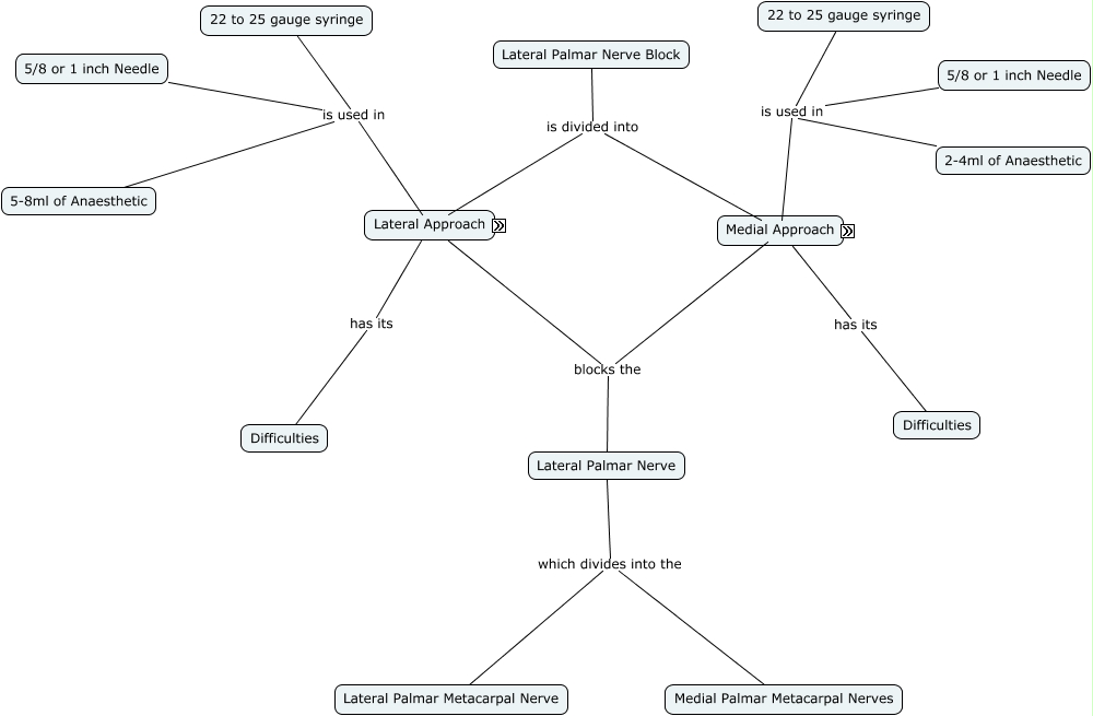 This Concept Map, created with IHMC CmapTools, has information related to: Lateral Palmar Block of Forelimb, Lateral Approach can be demarkated by Landmarks, Medial Approach can be demarkated by Landarmks, Medial Approach desensitizes the Deep and Superficial Strcutres on the Palmar Aspect of the Metacarpus, Lateral Approach desensitizes Origin of Suspensory Ligament, Lateral Palmar Nerve Block is divided into Medial Approach, 5-8ml of Anaesthetic is used in Lateral Approach, Lateral Palmar Nerve Block is divided into Lateral Approach, Lateral Palmar Nerve which divides into the Medial Palmar Metacarpal Nerves, Medial Approach blocks the Lateral Palmar Nerve, Landmarks include Distal Border of Accessory Carpal Bone, Landarmks include Axial Border of Accessory Carpal Bone, 5/8 or 1 inch Needle is used in Lateral Approach, Lateral Approach blocks the Lateral Palmar Nerve, Lateral Approach has its Difficulties, 22 to 25 gauge syringe is used in Lateral Approach, Medial Approach has its Difficulties, 5/8 or 1 inch Needle is used in Medial Approach, Lateral Approach desensitizes Deep Structures of the Palmar Metacarpus, Lateral Palmar Nerve which divides into the Lateral Palmar Metacarpal Nerve, Landmarks include Deep Digital Flexor Tendon