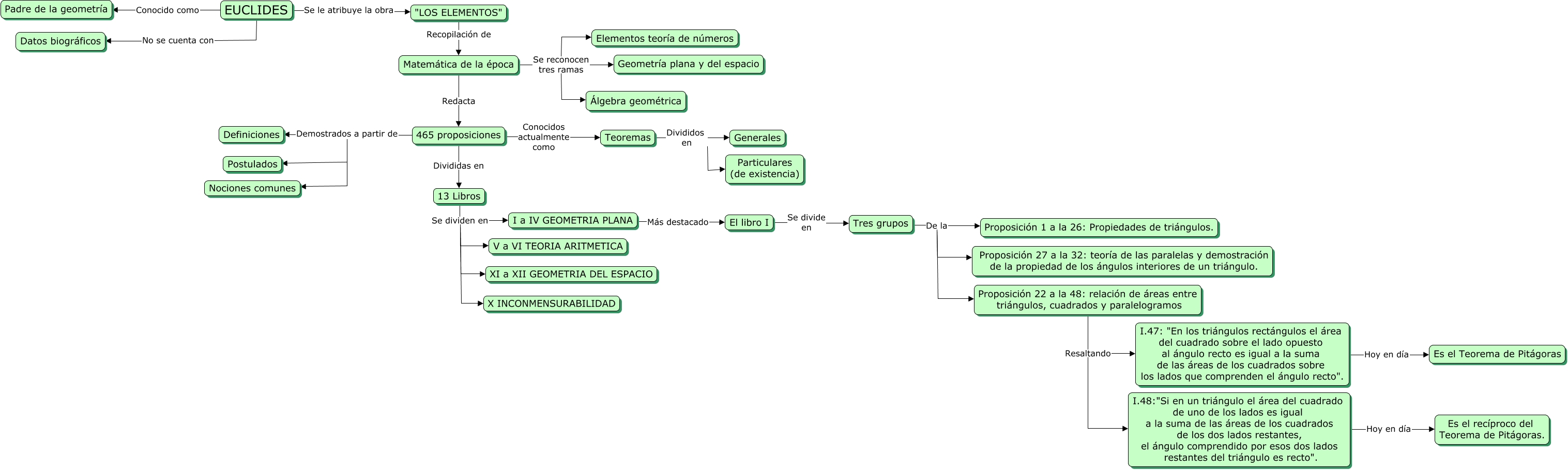 Este Cmap, tiene información relacionada con: 6. Euclides, 465 proposiciones Demostrados a partir de Nociones comunes, 13 Libros Se dividen en V a VI TEORIA ARITMETICA, 13 Libros Se dividen en I a IV GEOMETRIA PLANA, I a IV GEOMETRIA PLANA Más destacado El libro I, Tres grupos De la Proposición 27 a la 32: teoría de las paralelas y demostración de la propiedad de los ángulos interiores de un triángulo., Matemática de la época Se reconocen tres ramas Álgebra geométrica, Matemática de la época Se reconocen tres ramas Elementos teoría de números, "LOS ELEMENTOS" Recopilación de Matemática de la época, Tres grupos De la Proposición 1 a la 26: Propiedades de triángulos., Teoremas Divididos en Particulares (de existencia), EUCLIDES No se cuenta con Datos biográficos, I.47: "En los triángulos rectángulos el área del cuadrado sobre el lado opuesto al ángulo recto es igual a la suma de las áreas de los cuadrados sobre los lados que comprenden el ángulo recto". Hoy en día Es el Teorema de Pitágoras, 465 proposiciones Demostrados a partir de Definiciones, 13 Libros Se dividen en X INCONMENSURABILIDAD, Tres grupos De la Proposición 22 a la 48: relación de áreas entre triángulos, cuadrados y paralelogramos, EUCLIDES Conocido como Padre de la geometría, 465 proposiciones Conocidos actualmente como Teoremas, 13 Libros Se dividen en XI a XII GEOMETRIA DEL ESPACIO, 465 proposiciones Divididas en 13 Libros, Proposición 22 a la 48: relación de áreas entre triángulos, cuadrados y paralelogramos Resaltando I.47: "En los triángulos rectángulos el área del cuadrado sobre el lado opuesto al ángulo recto es igual a la suma de las áreas de los cuadrados sobre los lados que comprenden el ángulo recto".