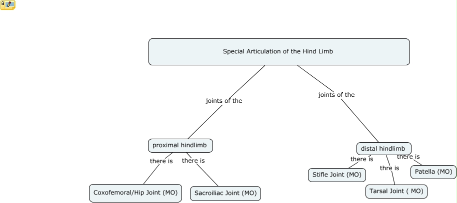 This Concept Map, created with IHMC CmapTools, has information related to: Special Articulation of the hindlimb, distal hindlimb there is Patella (MO), Special Articulation of the Hind Limb joints of the proximal hindlimb, distal hindlimb there is Stifle Joint (MO), proximal hindlimb there is Sacroiliac Joint (MO), Special Articulation of the Hind Limb joints of the distal hindlimb, proximal hindlimb there is Coxofemoral/Hip Joint (MO), distal hindlimb thre is Tarsal Joint ( MO)