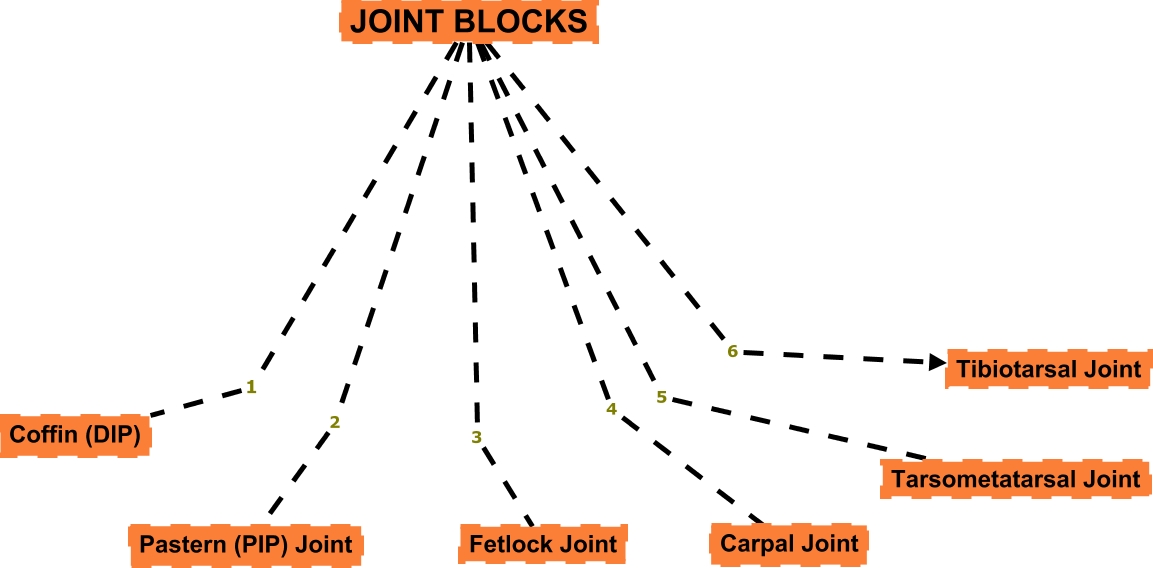 This Concept Map, created with IHMC CmapTools, has information related to: Joint Block CMAP, JOINT BLOCKS 5 Tarsometatarsal Joint, JOINT BLOCKS 3 Fetlock Joint, JOINT BLOCKS 4 Carpal Joint, JOINT BLOCKS 2 Pastern (PIP) Joint, JOINT BLOCKS 6 Tibiotarsal Joint, JOINT BLOCKS 1 Coffin (DIP)