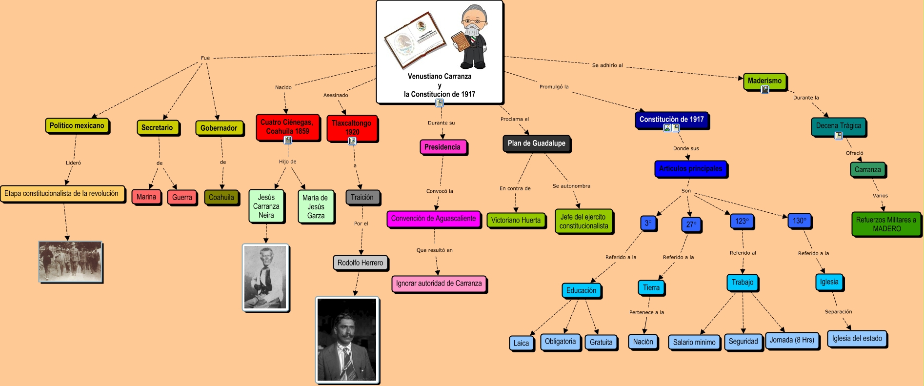 Este Cmap, tiene información relacionada con: Mapa conceptual colaborativo, Carranza Varios Refuerzos Militares a MADERO, Iglesia Separación Iglesia del estado, Artículos principales Son 123°, Venustiano Carranza y la Constitucion de 1917 Proclama el Plan de Guadalupe, Venustiano Carranza y la Constitucion de 1917 Nacido Cuatro Ciénegas, Coahuila 1859, 123° Referido al Trabajo, Trabajo ???? Salario minimo, 27° Referido a la Tierra, Venustiano Carranza y la Constitucion de 1917 Se adhirío al Maderismo, Venustiano Carranza y la Constitucion de 1917 Promulgó la Constitución de 1917, Trabajo Seguridad, Plan de Guadalupe En contra de Victoriano Huerta, Presidencia Convocó la Convención de Aguascaliente, Decena Trágica Ofreció Carranza, Político mexicano Lideró Etapa constitucionalista de la revolución, Traición Por el Rodolfo Herrero, Venustiano Carranza y la Constitucion de 1917 Fue Gobernador, Cuatro Ciénegas, Coahuila 1859 Hijo de María de Jesús Garza, Etapa constitucionalista de la revolución, 3° Referido a la Educación