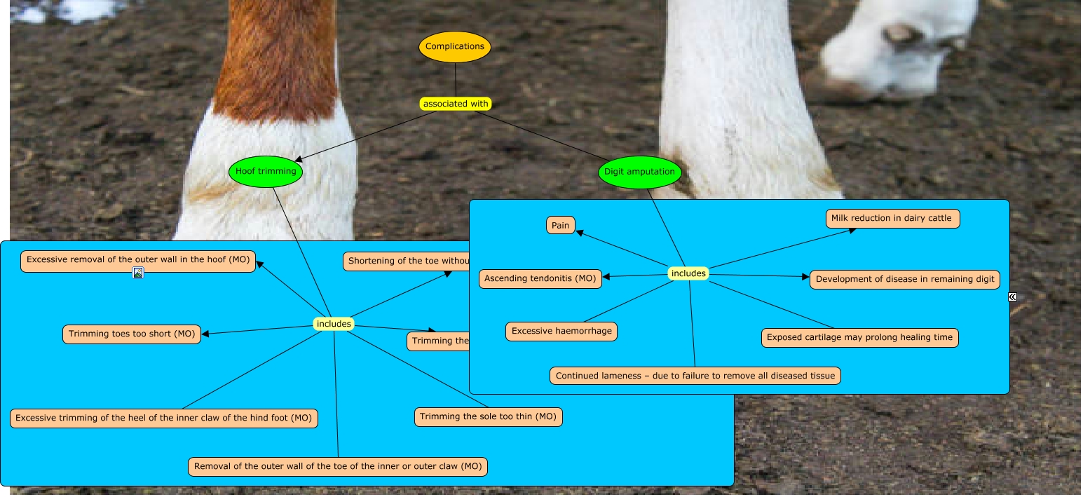 This Concept Map, created with IHMC CmapTools, has information related to: Lab 5 Complications, Digit amputation includes Development of disease in remaining digit, Hoof trimming includes Excessive removal of the outer wall in the hoof (MO), Hoof trimming includes Trimming the sole too thin (MO), Digit amputation includes Ascending tendonitis (MO), Hoof trimming includes Excessive trimming of the heel of the inner claw of the hind foot (MO), Hoof trimming includes Shortening of the toe without proper reduction of sole thickness (MO), Complications associated with Hoof trimming, Digit amputation includes Excessive haemorrhage, Hoof trimming includes Trimming the sole of claws with extreme concavity rather than flat (MO), Complications associated with Digit amputation, Hoof trimming includes Trimming toes too short (MO), Digit amputation includes Continued lameness – due to failure to remove all diseased tissue, Digit amputation includes Exposed cartilage may prolong healing time, Hoof trimming includes Removal of the outer wall of the toe of the inner or outer claw (MO), Digit amputation includes Pain, Digit amputation includes Milk reduction in dairy cattle
