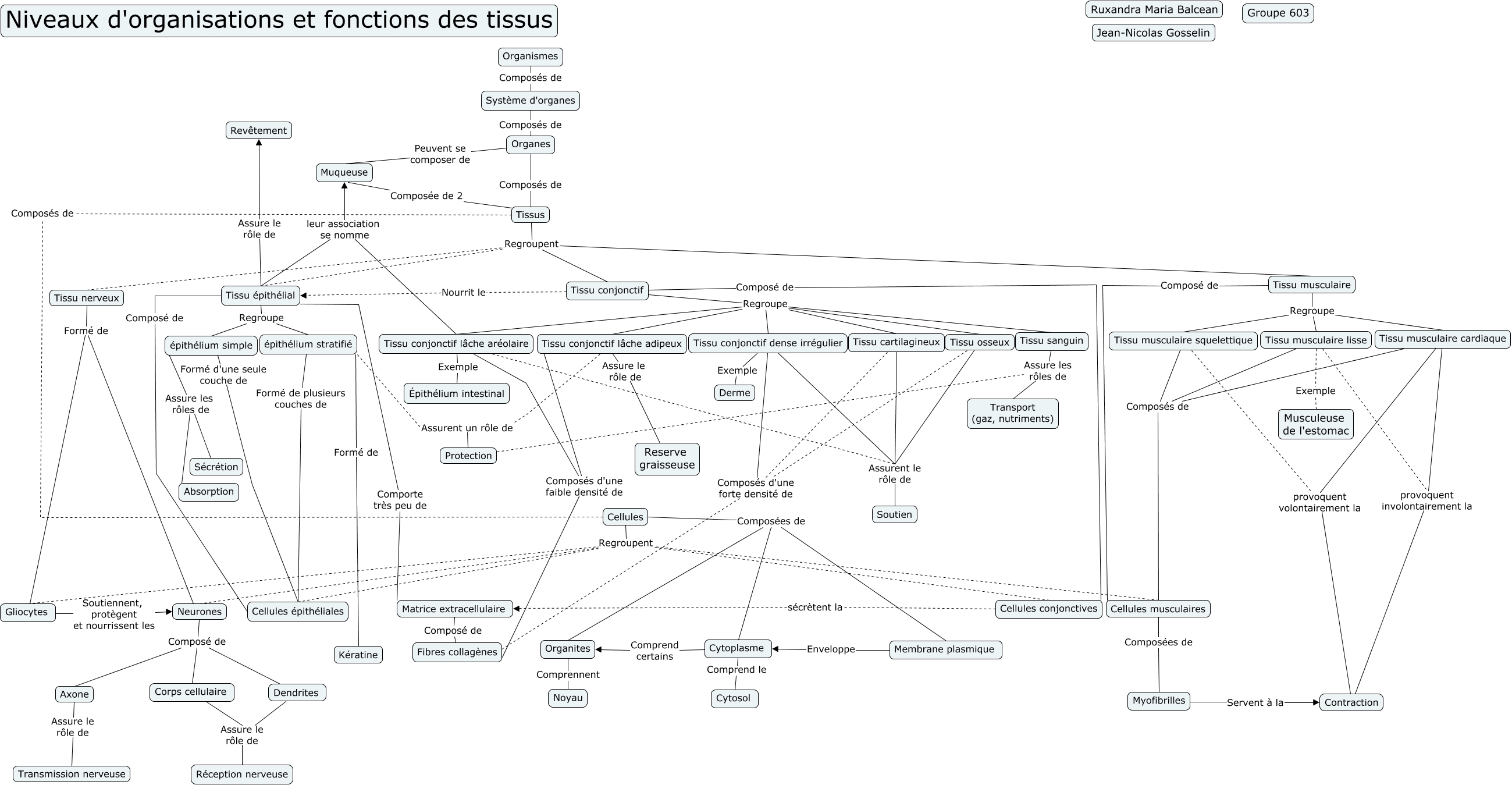 This Concept Map, created with IHMC CmapTools, has information related to: reseau de concept bio JN Maria finall, Membrane plasmique Enveloppe Cytoplasme, Neurones Composé de Axone, Tissu conjonctif dense irrégulier Exemple Derme, Tissu conjonctif lâche aréolaire Regroupe Tissu conjonctif dense irrégulier, Tissu conjonctif dense irrégulier Composés d'une forte densité de Fibres collagènes, Système d'organes Composés de Organes, Tissu osseux Composés d'une forte densité de Fibres collagènes, Neurones Composé de Corps cellulaire, Dendrites Composé de Axone, Tissu conjonctif Regroupe Tissu conjonctif dense irrégulier, Tissu cartilagineux Composés d'une forte densité de Fibres collagènes, Tissu conjonctif lâche adipeux Regroupe Tissu conjonctif dense irrégulier, Tissu cartilagineux Regroupe Tissu conjonctif dense irrégulier, Dendrites Composé de Corps cellulaire, Organites Comprennent Noyau, Cellules conjonctives sécrètent la Matrice extracellulaire, épithélium stratifié Formé de Kératine, Cytoplasme Composées de Membrane plasmique, Cytoplasme Comprend le Cytosol, Tissu musculaire squelettique Composés de Cellules musculaires