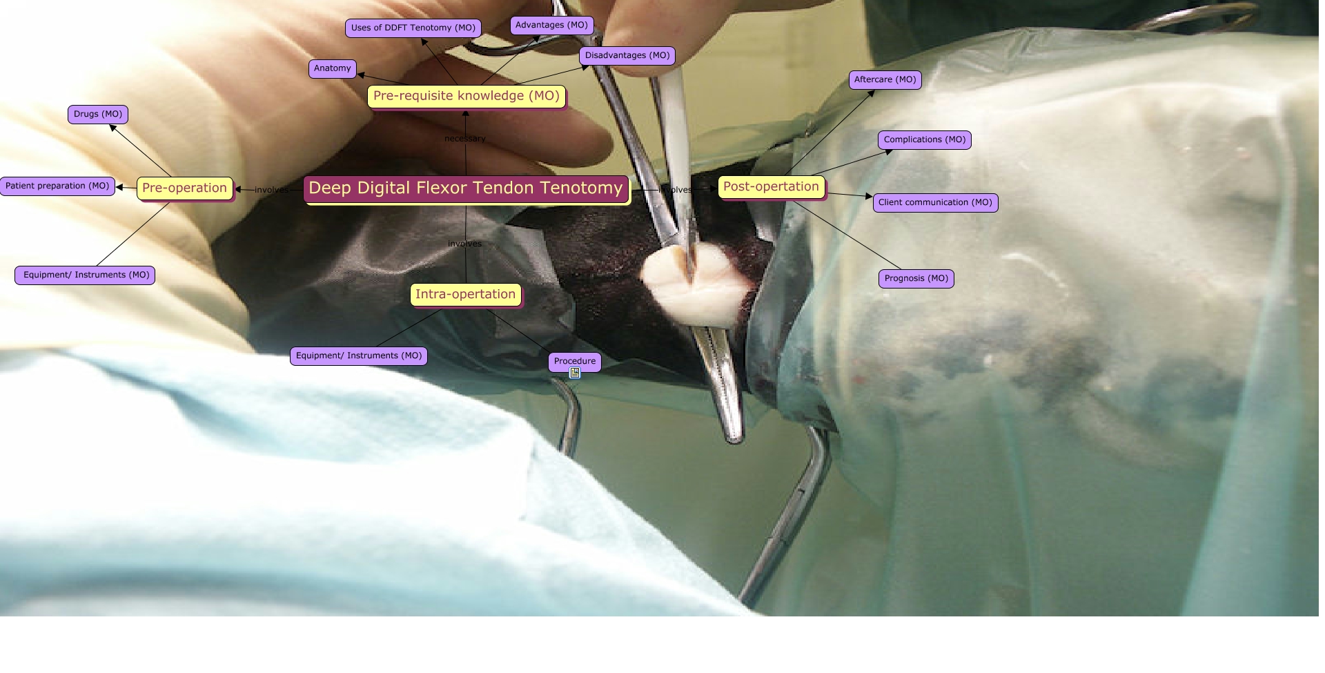 This Concept Map, created with IHMC CmapTools, has information related to: Deep Digital Flexor Tendon Tenotomy, Intra-opertation Equipment/ Instruments (MO), Pre-operation Patient preparation (MO), Post-opertation Prognosis (MO), Post-opertation Aftercare (MO), Pre-requisite knowledge (MO) Disadvantages (MO), Pre-requisite knowledge (MO) Advantages (MO), Deep Digital Flexor Tendon Tenotomy involves Intra-opertation, Post-opertation Client communication (MO), Deep Digital Flexor Tendon Tenotomy involves Post-opertation, Intra-opertation Procedure, Post-opertation Complications (MO), Pre-operation Drugs (MO), Deep Digital Flexor Tendon Tenotomy involves Pre-operation, Pre-requisite knowledge (MO) Anatomy, Pre-operation Equipment/ Instruments (MO), Pre-requisite knowledge (MO) Uses of DDFT Tenotomy (MO), Deep Digital Flexor Tendon Tenotomy necessary Pre-requisite knowledge (MO)