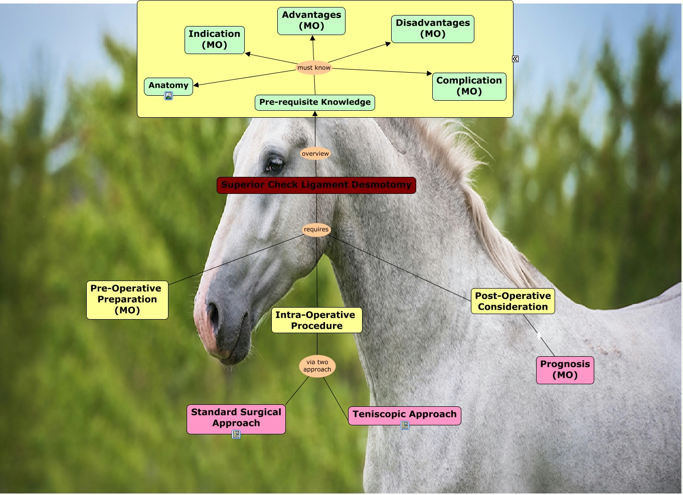 This Concept Map, created with IHMC CmapTools, has information related to: Superior Check Ligament Desmotomy, Pre-requisite Knowledge must know Disadvantages (MO), Intra-Operative Procedure via two approach Teniscopic Approach, Superior Check Ligament Desmotomy requires Intra-Operative Procedure, Superior Check Ligament Desmotomy requires Post-Operative Consideration, Post-Operative Consideration Prognosis (MO), Pre-requisite Knowledge must know Advantages (MO), Pre-requisite Knowledge must know Complication (MO), Pre-requisite Knowledge must know Anatomy, Pre-requisite Knowledge must know Indication (MO), Superior Check Ligament Desmotomy requires Pre-Operative Preparation (MO), Superior Check Ligament Desmotomy overview Pre-requisite Knowledge, Intra-Operative Procedure via two approach Standard Surgical Approach