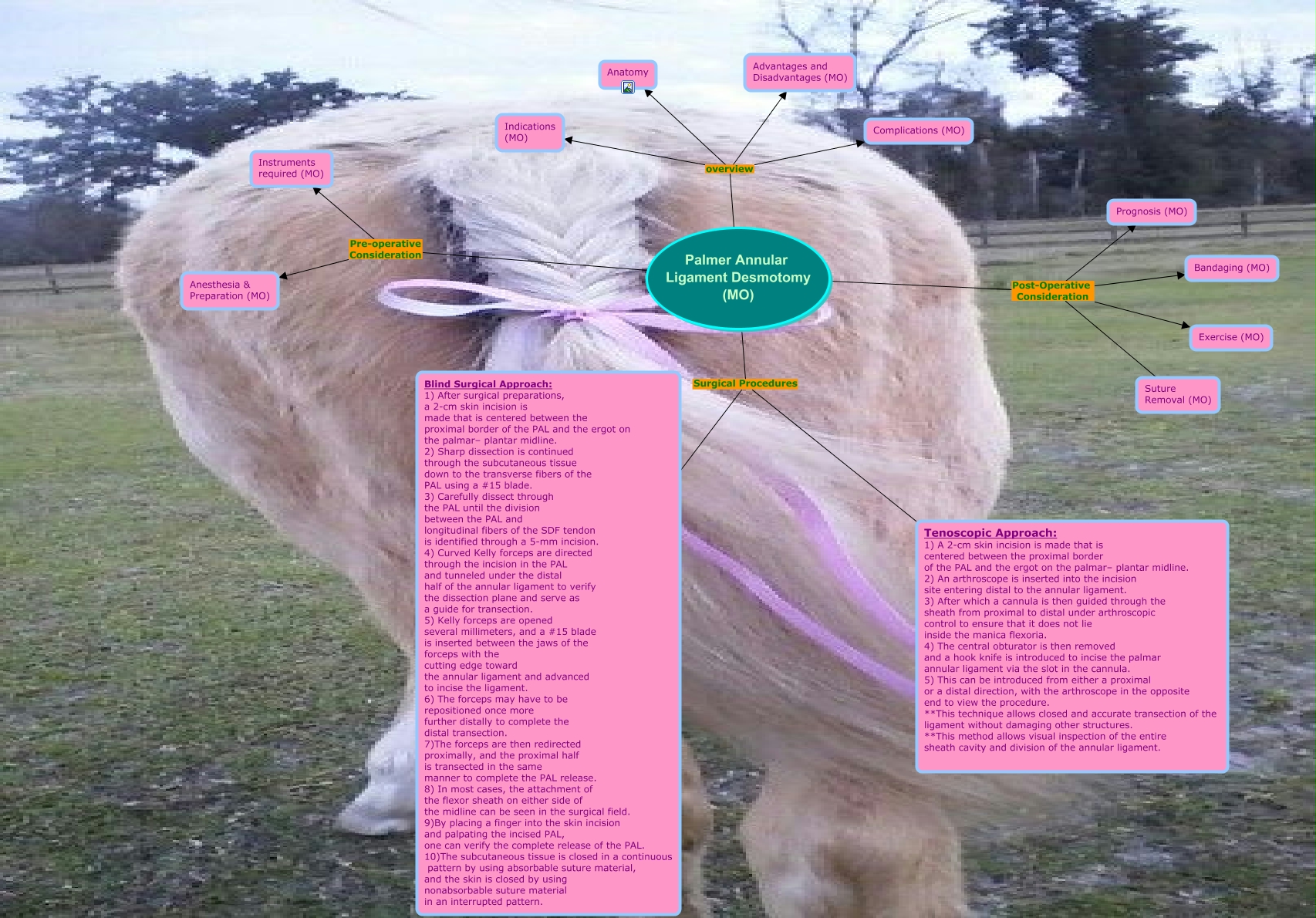 This Concept Map, created with IHMC CmapTools, has information related to: Palmer Annular Ligament 5, Palmer Annular Ligament Desmotomy (MO) Surgical Procedures Tenoscopic Approach: 1) A 2-cm skin incision is made that is centered between the proximal border of the PAL and the ergot on the palmar– plantar midline. 2) An arthroscope is inserted into the incision site entering distal to the annular ligament. 3) After which a cannula is then guided through the sheath from proximal to distal under arthroscopic control to ensure that it does not lie inside the manica flexoria. 4) The central obturator is then removed and a hook knife is introduced to incise the palmar annular ligament via the slot in the cannula. 5) This can be introduced from either a proximal or a distal direction, with the arthroscope in the opposite end to view the procedure. **This technique allows closed and accurate transection of the ligament without damaging other structures. **This method allows visual inspection of the entire sheath cavity and division of the annular ligament., Palmer Annular Ligament Desmotomy (MO) Pre-operative Consideration Instruments required (MO), Palmer Annular Ligament Desmotomy (MO) overview Anatomy, Palmer Annular Ligament Desmotomy (MO) Post-Operative Consideration Bandaging (MO), Palmer Annular Ligament Desmotomy (MO) Post-Operative Consideration Prognosis (MO), Palmer Annular Ligament Desmotomy (MO) overview Advantages and Disadvantages (MO), Palmer Annular Ligament Desmotomy (MO) Pre-operative Consideration Anesthesia & Preparation (MO), Palmer Annular Ligament Desmotomy (MO) overview Complications (MO), Palmer Annular Ligament Desmotomy (MO) Post-Operative Consideration Exercise (MO), Palmer Annular Ligament Desmotomy (MO) Post-Operative Consideration Suture Removal (MO), Palmer Annular Ligament Desmotomy (MO) Surgical Procedures Blind Surgical Approach: 1) After surgical preparations, a 2-cm skin incision is made that is centered between the proximal border of the PAL and the ergot on the palmar– plantar midline. 2) Sharp dissection is continued through the subcutaneous tissue down to the transverse fibers of the PAL using a #15 blade. 3) Carefully dissect through the PAL until the division between the PAL and longitudinal fibers of the SDF tendon is identified through a 5-mm incision. 4) Curved Kelly forceps are directed through the incision in the PAL and tunneled under the distal half of the annular ligament to verify the dissection plane and serve as a guide for transection. 5) Kelly forceps are opened several millimeters, and a #15 blade is inserted between the jaws of the forceps with the cutting edge toward the annular ligament and advanced to incise the ligament. 6) The forceps may have to be repositioned once more further distally to complete the distal transection. 7)The forceps are then redirected proximally, and the proximal half is transected in the same manner to complete the PAL release. 8) In most cases, the attachment of the flexor sheath on either side of the midline can be seen in the surgical field. 9)By placing a finger into the skin incision and palpating the incised PAL, one can verify the complete release of the PAL. 10)The subcutaneous tissue is closed in a continuous pattern by using absorbable suture material, and the skin is closed by using nonabsorbable suture material in an interrupted pattern., Palmer Annular Ligament Desmotomy (MO) overview Indications (MO)