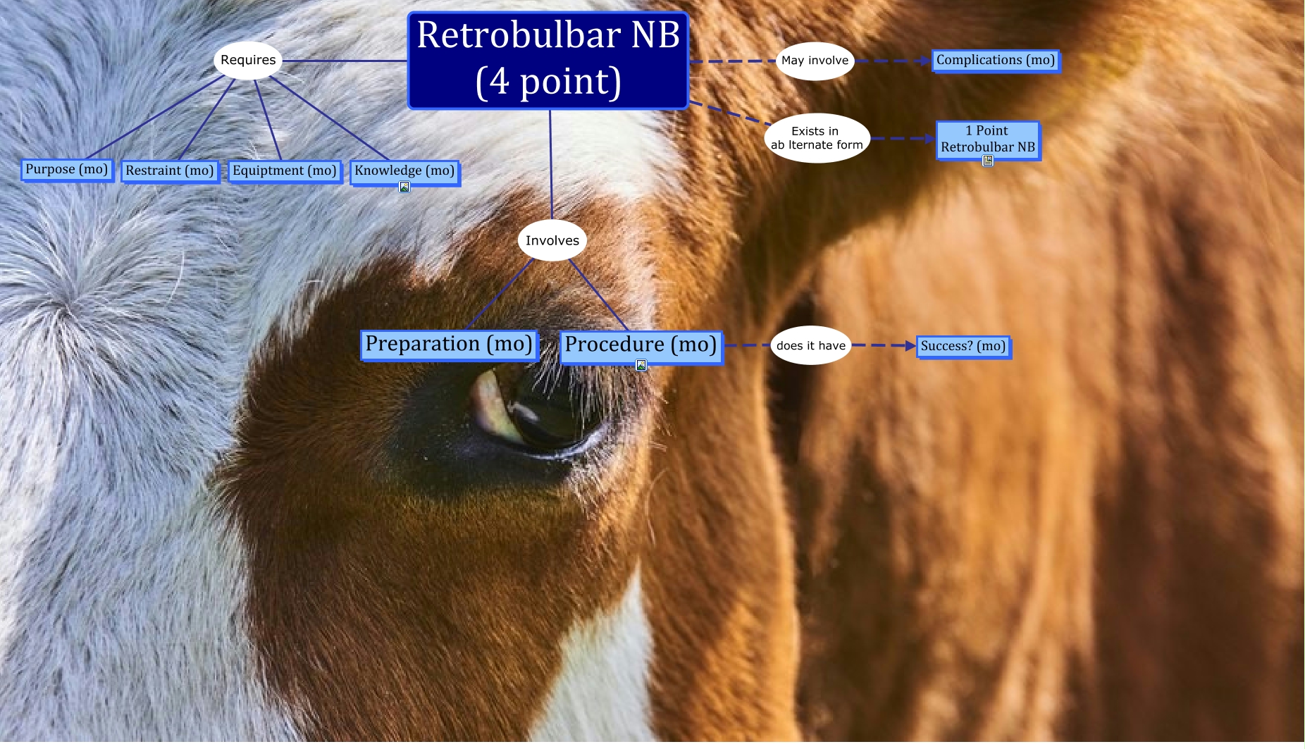 This Concept Map, created with IHMC CmapTools, has information related to: Retrobulbar Nerve Block CMAP, Retrobulbar NB (4 point) Requires Equiptment (mo), Retrobulbar NB (4 point) Requires Knowledge (mo), Retrobulbar NB (4 point) May involve Complications (mo), Retrobulbar NB (4 point) Requires Restraint (mo), Procedure (mo) does it have Success? (mo), Retrobulbar NB (4 point) Involves Procedure (mo), Retrobulbar NB (4 point) Requires Purpose (mo), Retrobulbar NB (4 point) Involves Preparation (mo), Retrobulbar NB (4 point) Exists in ab lternate form 1 Point Retrobulbar NB