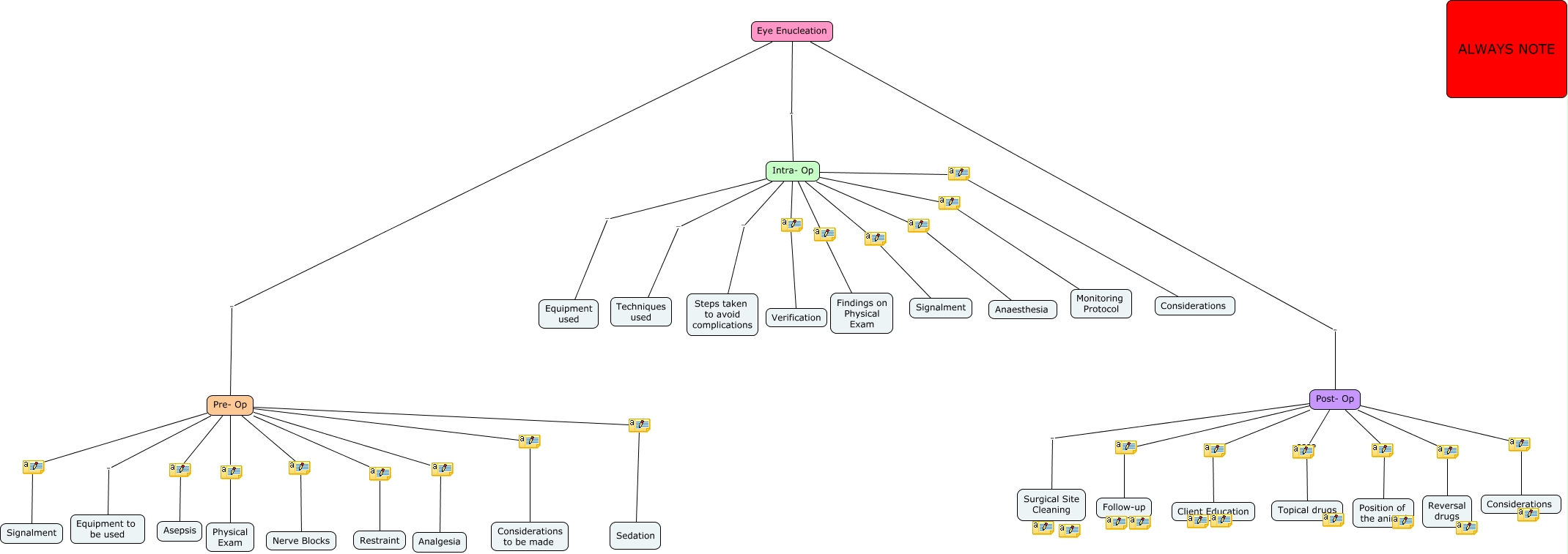This Concept Map, created with IHMC CmapTools, has information related to: Group E Lab- Eye Enucleation, Intra- Op ???? Monitoring Protocol, Intra- Op ???? Findings on Physical Exam, Intra- Op ???? Anaesthesia, Pre- Op ???? Analgesia, Pre- Op ???? Sedation, Eye Enucleation . Intra- Op, Post- Op ???? Considerations, Eye Enucleation . Post- Op, Post- Op ???? Reversal drugs, Post- Op . Surgical Site Cleaning, Pre- Op ???? Nerve Blocks, Pre- Op ???? Restraint, Pre- Op ???? Physical Exam, Post- Op ???? Position of the animal, Intra- Op ???? Signalment, Intra- Op ???? Verification, Intra- Op - Steps taken to avoid complications, Intra- Op ???? Considerations, Intra- Op - Equipment used, Pre- Op ???? Considerations to be made