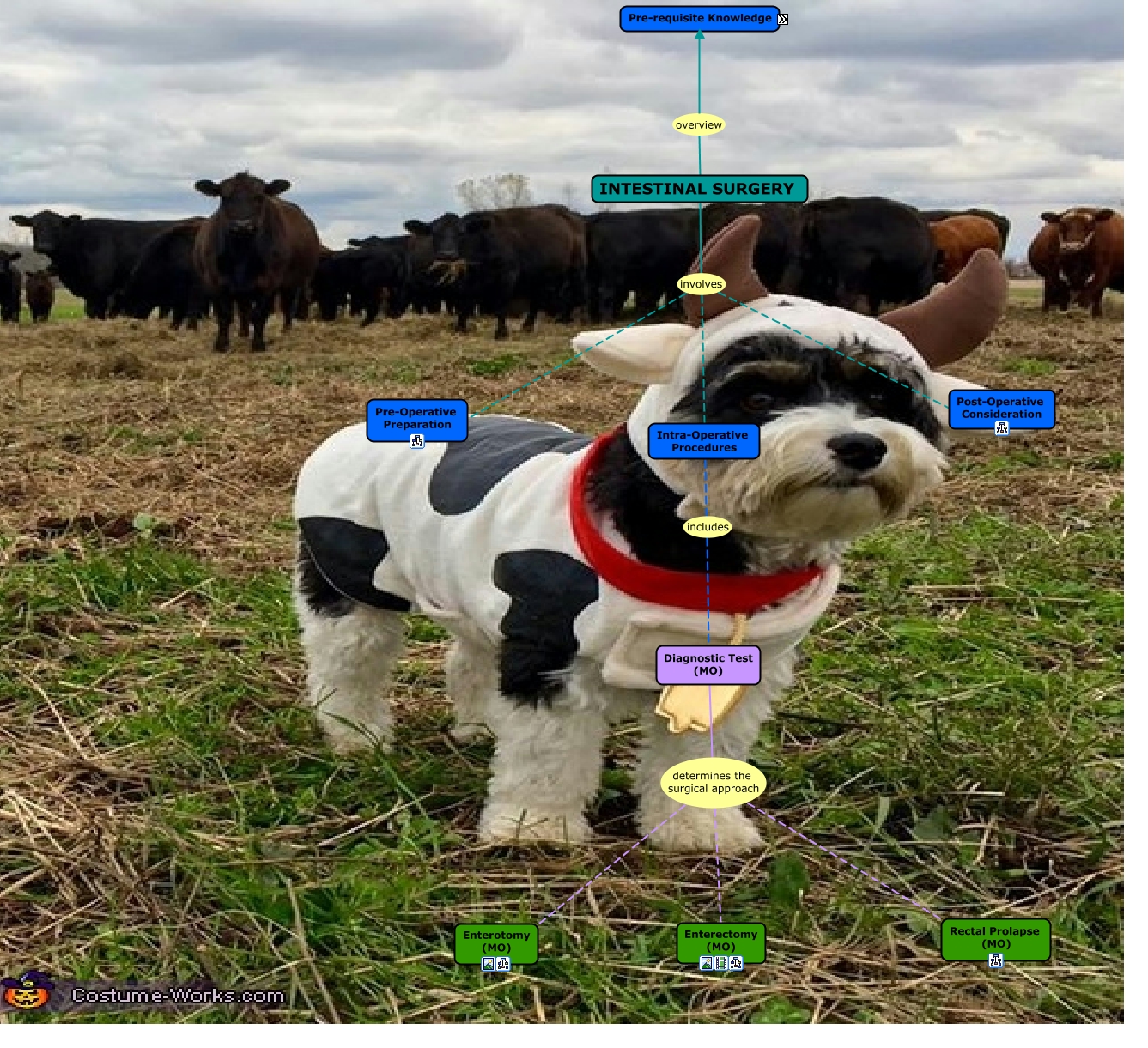 This Concept Map, created with IHMC CmapTools, has information related to: Lab 8 Intestinal Surgery, INTESTINAL SURGERY involves Post-Operative Consideration, Diagnostic Test (MO) determines the surgical approach Enterotomy (MO), Pre-requisite Knowledge must know Disadvantage (MO), Intra-Operative Procedures includes Diagnostic Test (MO), Pre-requisite Knowledge must know Advantage (MO), INTESTINAL SURGERY involves Intra-Operative Procedures, Pre-requisite Knowledge must know Complication (MO), Diagnostic Test (MO) determines the surgical approach Rectal Prolapse (MO), INTESTINAL SURGERY overview Pre-requisite Knowledge, Diagnostic Test (MO) determines the surgical approach Enterectomy (MO), Pre-requisite Knowledge must know Anatomy, Pre-requisite Knowledge must know Indication (MO), INTESTINAL SURGERY involves Pre-Operative Preparation