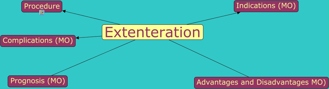 This Concept Map, created with IHMC CmapTools, has information related to: Extenteration, Extenteration Procedure, Extenteration Advantages and Disadvantages MO), Extenteration Prognosis (MO), Extenteration Indications (MO), Extenteration Complications (MO)