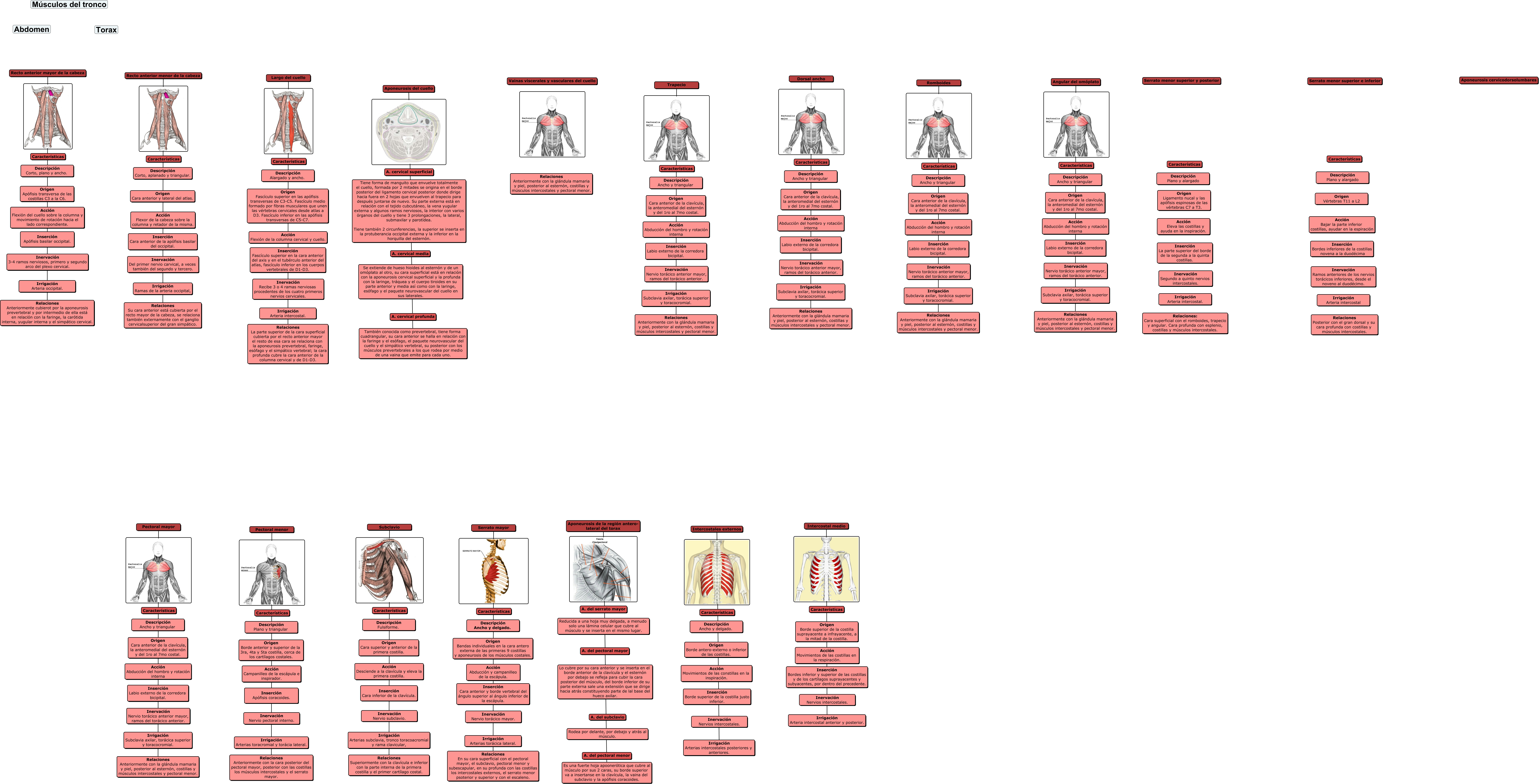 Este Cmap, tiene información relacionada con: Sin Título, Aponeurosis de la región antero- lateral del torax Es una fuerte hoja apoonerótica que cubre al músculo por sus 2 caras, su borde superior va a insertanse en la clavícula, la vaina del subclavio y la apófisis coracoides., Intercostal medio Irrigación Arteria intercostal anterior y posterior., Recto anterior menor de la cabeza ???? Relaciones Su cara anterior está cubierta por el recto mayor de la cabeza, se relaciona también externamente con el ganglio cervicalsuperior del gran simpático., Serrato mayor Relaciones En su cara superficial con el pectoral mayor, el subclavio, pectoral menor y subescapular, en su profunda con las costillas los intercostales externos, el serrato menor psoterior y superior y con el escaleno., Intercostales externos Irrigación Arterias intercostales posteriores y anteriores., Dorsal ancho ???? Relaciones Anteriormente con la glándula mamaria y piel, posterior al esternón, costillas y músculos intercostales y pectoral menor., Largo del cuello ???? Relaciones La parte superior de la cara superficial cubierta por el recto anterior mayor el resto de esa cara se relaciona con la aponeurosis prevertebral, faringe, esófago y el simpático vertebral; la cara profunda cubre la cara anterior de la columna cervical y de D1-D3., Trapecio ???? Relaciones Anteriormente con la glándula mamaria y piel, posterior al esternón, costillas y músculos intercostales y pectoral menor., Pectoral menor Relaciones Anteriormente con la cara posterior del pectoral mayor, posterior con las costillas los músculos intercostales y el serrato mayor., Subclavio Relaciones Superiormente con la clavícula e inferior con la parte interna de la primera costilla y el primer cartílago costal., Pectoral mayor ???? Relaciones Anteriormente con la glándula mamaria y piel, posterior al esternón, costillas y músculos intercostales y pectoral menor., Aponeurosis del cuello ???? También conocida como prevertebral, tiene forma cuadrangular, su cara anterior se halla en relación con la faringe y el esófago, el paquete neurovascular del cuello y el simpático vertebral, su posterior con los músculos prevertebrales a los que rodea por medio de una vaina que emite para cada uno., Angular del omóplato ???? Relaciones Anteriormente con la glándula mamaria y piel, posterior al esternón, costillas y músculos intercostales y pectoral menor., Recto anterior mayor de la cabeza ???? Relaciones Anteriormente cubierot por la aponeurosis prevertebral y por intermedio de ella está en relación con la faringe, la carótida interna, yugular interna y el simpático cervical., Romboides ???? Relaciones Anteriormente con la glándula mamaria y piel, posterior al esternón, costillas y músculos intercostales y pectoral menor.