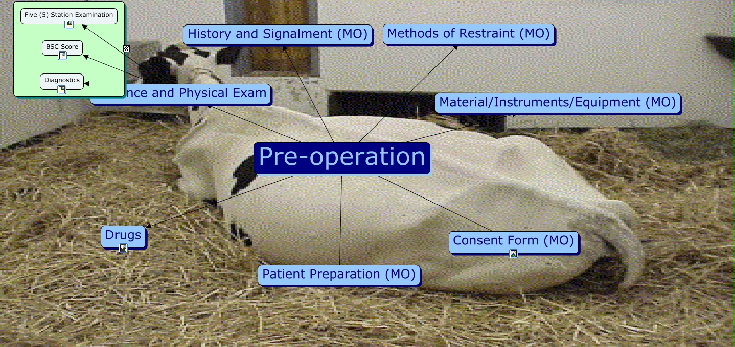 This Concept Map, created with IHMC CmapTools, has information related to: Pre-operative Procedures, Distance and Physical Exam BSC Score, Pre-operation Distance and Physical Exam, Distance and Physical Exam Five (5) Station Examination, Pre-operation Material/Instruments/Equipment (MO), Pre-operation Drugs, Pre-operation Methods of Restraint (MO), Pre-operation Patient Preparation (MO), Pre-operation History and Signalment (MO), Distance and Physical Exam Diagnostics, Pre-operation Consent Form (MO)