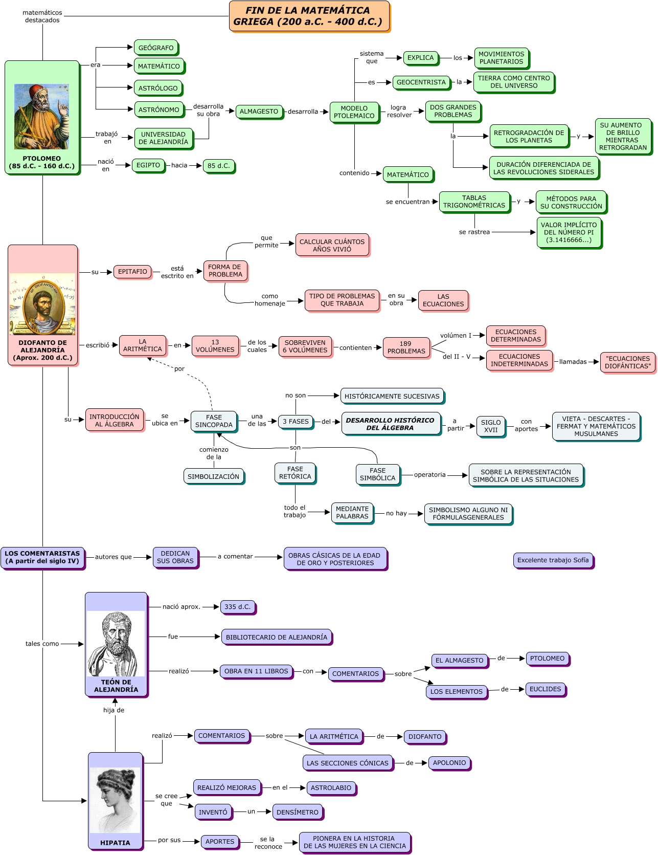 This Concept Map, created with IHMC CmapTools, has information related to: CUCCHIARELLI - FIN DE LA MATEMÁTICA GRIEGA, COMENTARIOS sobre LOS ELEMENTOS, ALMAGESTO desarrolla MODELO PTOLEMAICO, 189 PROBLEMAS volúmen I ECUACIONES DETERMINADAS, SOBREVIVEN 6 VOLÚMENES contienten 189 PROBLEMAS, DIOFANTO DE ALEJANDRÍA (Aprox. 200 d.C.) escribió LA ARITMÉTICA, DESARROLLO HISTÓRICO DEL ÁLGEBRA a partir SIGLO XVII, DOS GRANDES PROBLEMAS la RETROGRADACIÓN DE LOS PLANETAS, APORTES se la reconoce PIONERA EN LA HISTORIA DE LAS MUJERES EN LA CIENCIA, 189 PROBLEMAS del II - V ECUACIONES INDETERMINADAS, LA ARITMÉTICA de DIOFANTO, MODELO PTOLEMAICO sistema que EXPLICA, LOS COMENTARISTAS (A partir del siglo IV) autores que DEDICAN SUS OBRAS, PTOLOMEO (85 d.C. - 160 d.C.) trabajó en UNIVERSIDAD DE ALEJANDRÍA, 3 FASES son FASE RETÓRICA, PTOLOMEO (85 d.C. - 160 d.C.) era MATEMÁTICO, EPITAFIO está esctrito en FORMA DE PROBLEMA, 3 FASES del DESARROLLO HISTÓRICO DEL ÁLGEBRA, HIPATIA por sus APORTES, 13 VOLÚMENES de los cuales SOBREVIVEN 6 VOLÚMENES, FASE SINCOPADA una de las 3 FASES