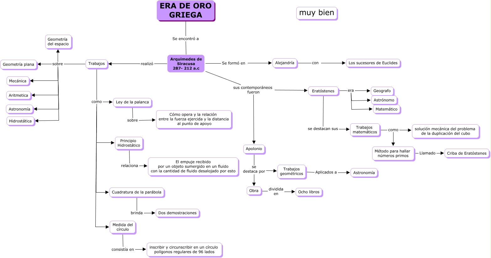 This Concept Map, created with IHMC CmapTools, has information related to: 7. Fin de la era de oro Griega, Trabajos sobre Geometría del espacio, Trabajos matemáticos como Método para hallar números primos, Trabajos sobre Mecánica, Trabajos como Ley de la palanca, Medida del círculo consistía en inscribir y circunscribir en un círculo polígonos regulares de 96 lados, Arquimedes de Siracusa 287- 212 a.c sus contemporáneos fueron Apolonio, Obra dividida en Ocho libros, Apolonio se destaca por Obra, Eratóstenes era Geografo, Cuadratura de la parábola brinda Dos demostraciones, Principio Hidrostático relaciona El empuje recibido por un objeto sumergido en un fluido con la cantidad de fluido desalojado por esto, Eratóstenes era Astrónomo, Trabajos sobre Hidrostática, Eratóstenes se destacan sus Trabajos matemáticos, Apolonio se destaca por Trabajos geométricos, Eratóstenes era Matemático, Trabajos sobre Aritmetica, Trabajos como Principio Hidrostático, Trabajos sobre Geometría plana, Trabajos sobre Astronomía