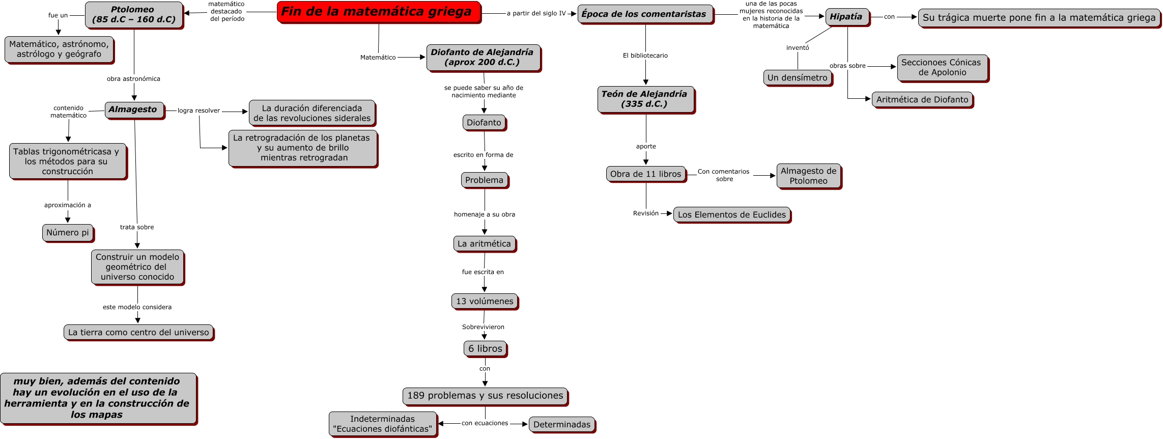 This Concept Map, created with IHMC CmapTools, has information related to: 8. Fin de la matemática Griega, Hipatía con Su trágica muerte pone fin a la matemática griega, 6 libros con 189 problemas y sus resoluciones, 189 problemas y sus resoluciones con ecuaciones Determinadas, Obra de 11 libros Con comentarios sobre Almagesto de Ptolomeo, Almagesto contenido matemático Tablas trigonométricasa y los métodos para su construcción, Tablas trigonométricasa y los métodos para su construcción aproximación a Número pi, Diofanto escrito en forma de Problema, Teón de Alejandría (335 d.C.) aporte Obra de 11 libros, Obra de 11 libros Revisión Los Elementos de Euclides, Fin de la matemática griega Matemático Diofanto de Alejandría (aprox 200 d.C.), Construir un modelo geométrico del universo conocido este modelo considera La tierra como centro del universo, Hipatía obras sobre Aritmética de Diofanto, Hipatía obras sobre Seccionoes Cónicas de Apolonio, 189 problemas y sus resoluciones con ecuaciones Indeterminadas "Ecuaciones diofánticas", Hipatía inventó Un densímetro, Diofanto de Alejandría (aprox 200 d.C.) se puede saber su año de nacimiento mediante Diofanto, Ptolomeo (85 d.C – 160 d.C) obra astronómica Almagesto, Almagesto logra resolver La duración diferenciada de las revoluciones siderales, Fin de la matemática griega matemático destacado del período Ptolomeo (85 d.C – 160 d.C), Época de los comentaristas El bibliotecario Teón de Alejandría (335 d.C.)